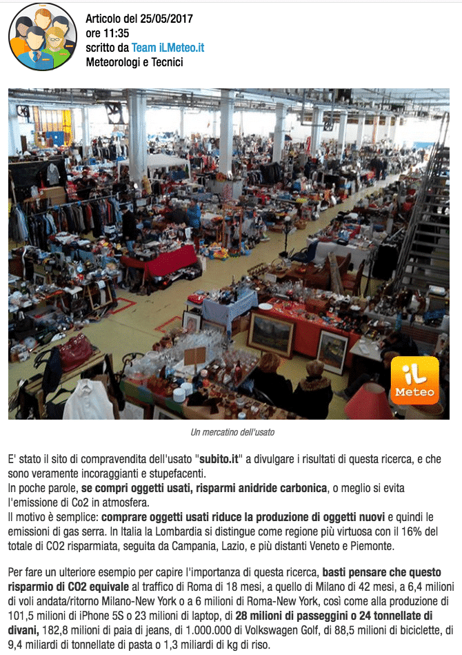 In poche parole, se compri oggetti usati, risparmi anidride carbonica, o meglio si evita l’emissione di Co2 in atmosfera.