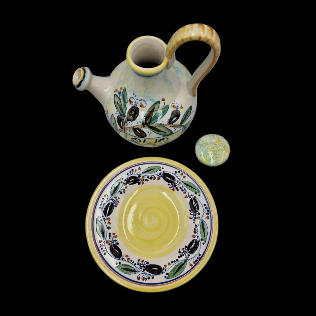 Questa ampolla da condimento con piattino si compone di tre elementi: l’ampolla principale, il pratico piattino coordinato e il tappo in ceramica, che garantisce una chiusura funzionale e decorativa. La forma slanciata dell’ampolla e le decorazioni realizzate a mano la rendono un oggetto unico, capace di coniugare bellezza e utilità.