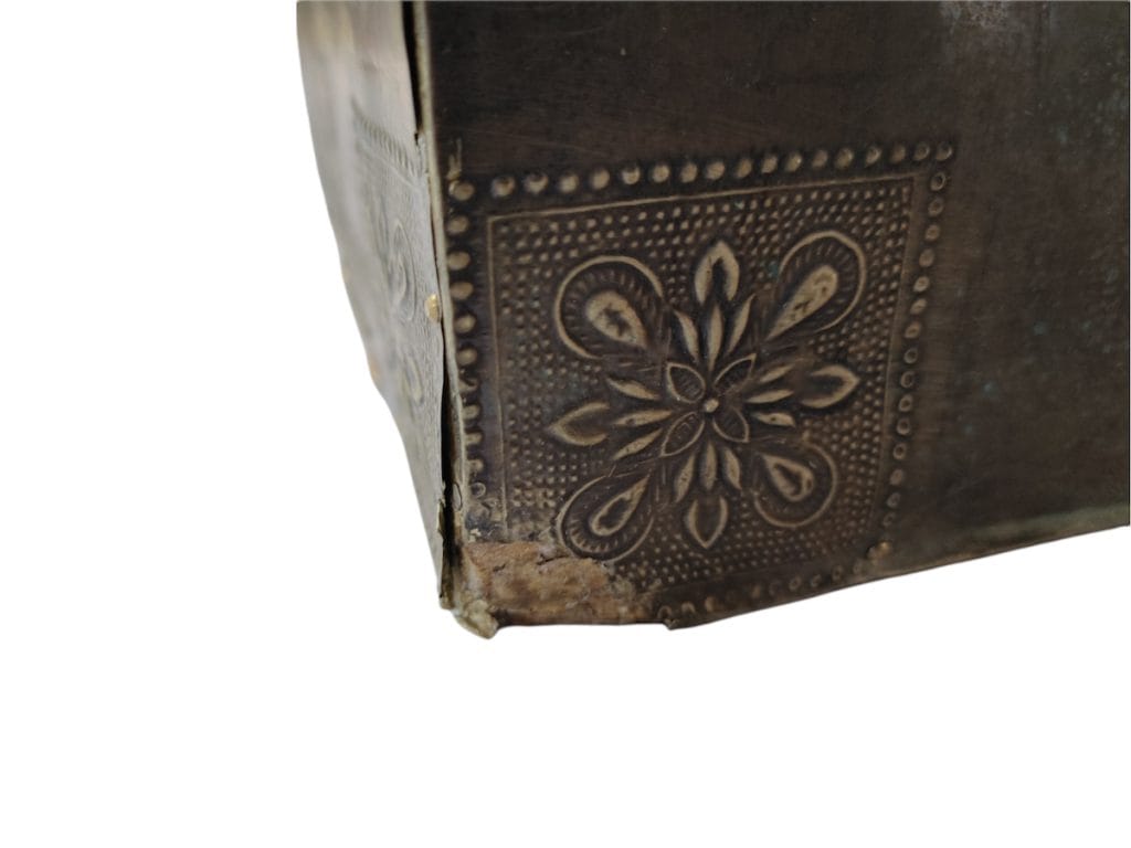 Bauletto in legno rivestito in lamina metallica con decorazioni sbalzate.Il baule ha maniglie sui lati e chiusura con cerniera centrale.Come visibile in foto, segnaliamo un angolo leggermente danneggiato.
