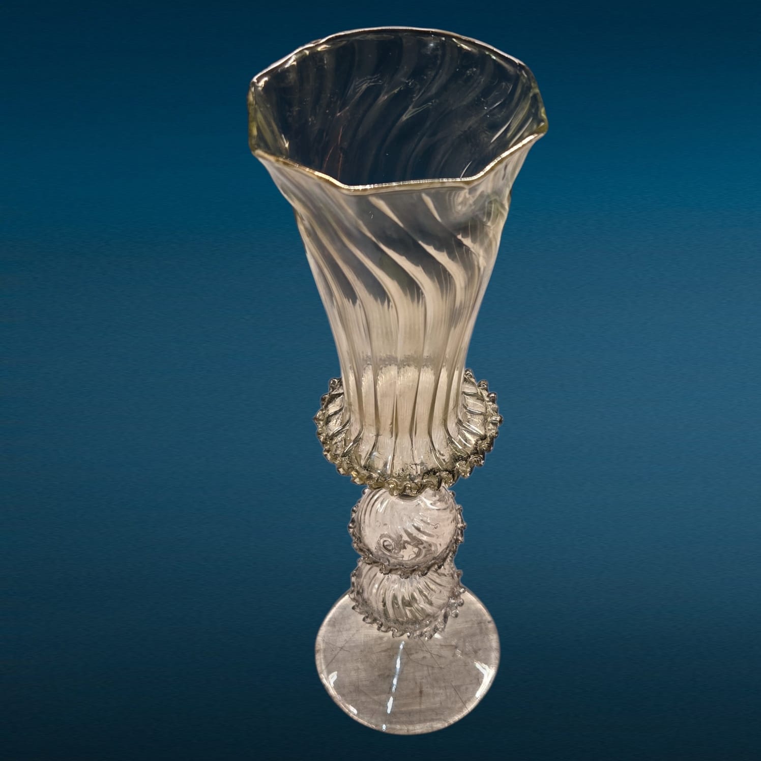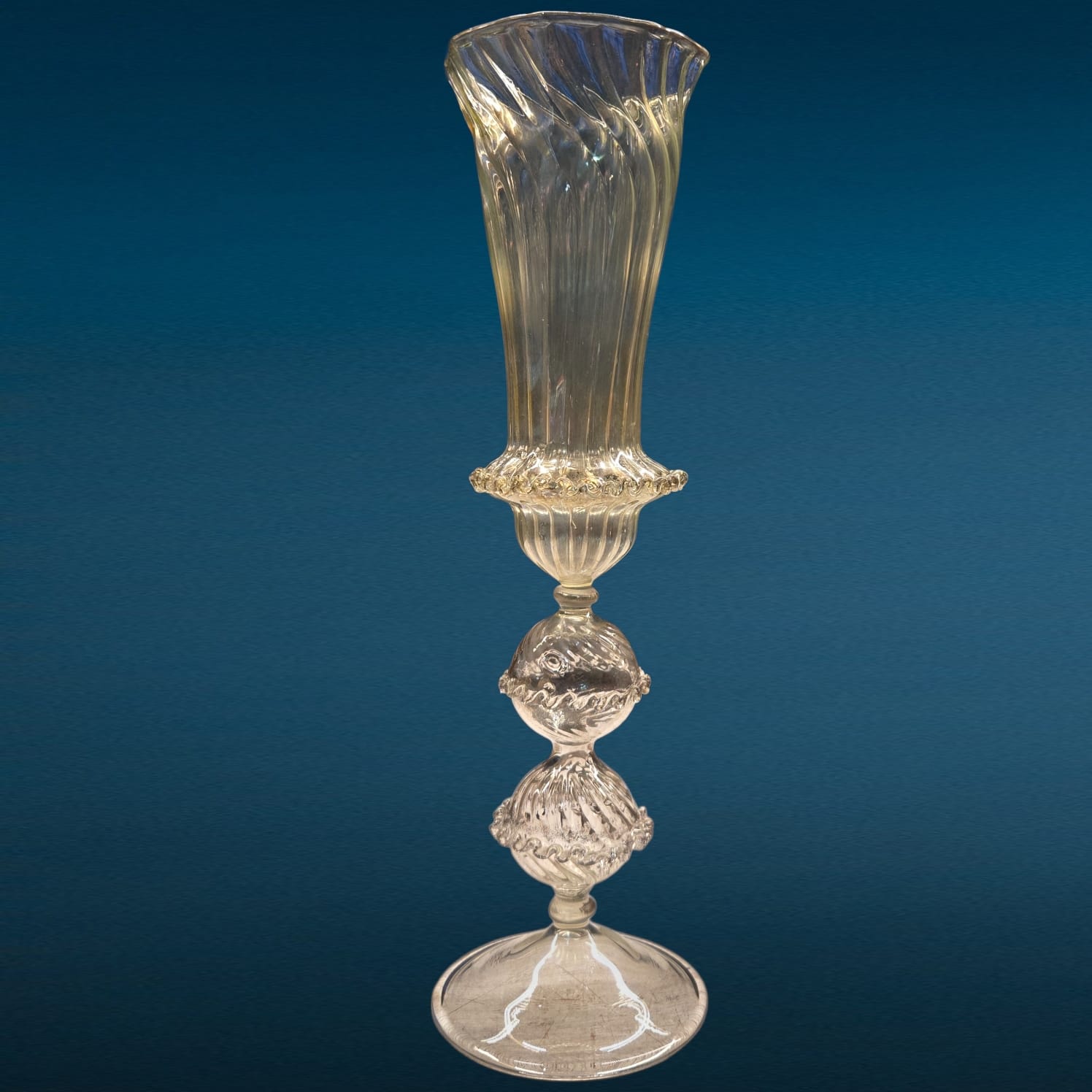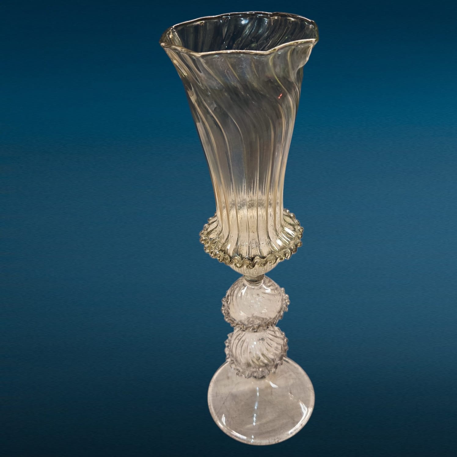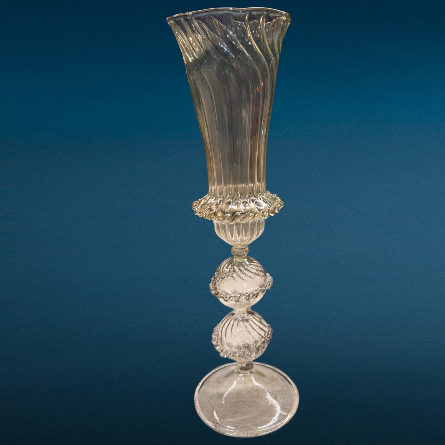 Bicchiere veneziano in vetro lavorato a mano, produzione tradizionale di area lagunare. Esemplare d’epoca, realizzato con tecnica di soffiatura. Presenta buone condizioni estetiche generali, con una piccola foratura nella base dovuta al processo di soffiatura del vetro. Oggetto decorativo e da collezione.