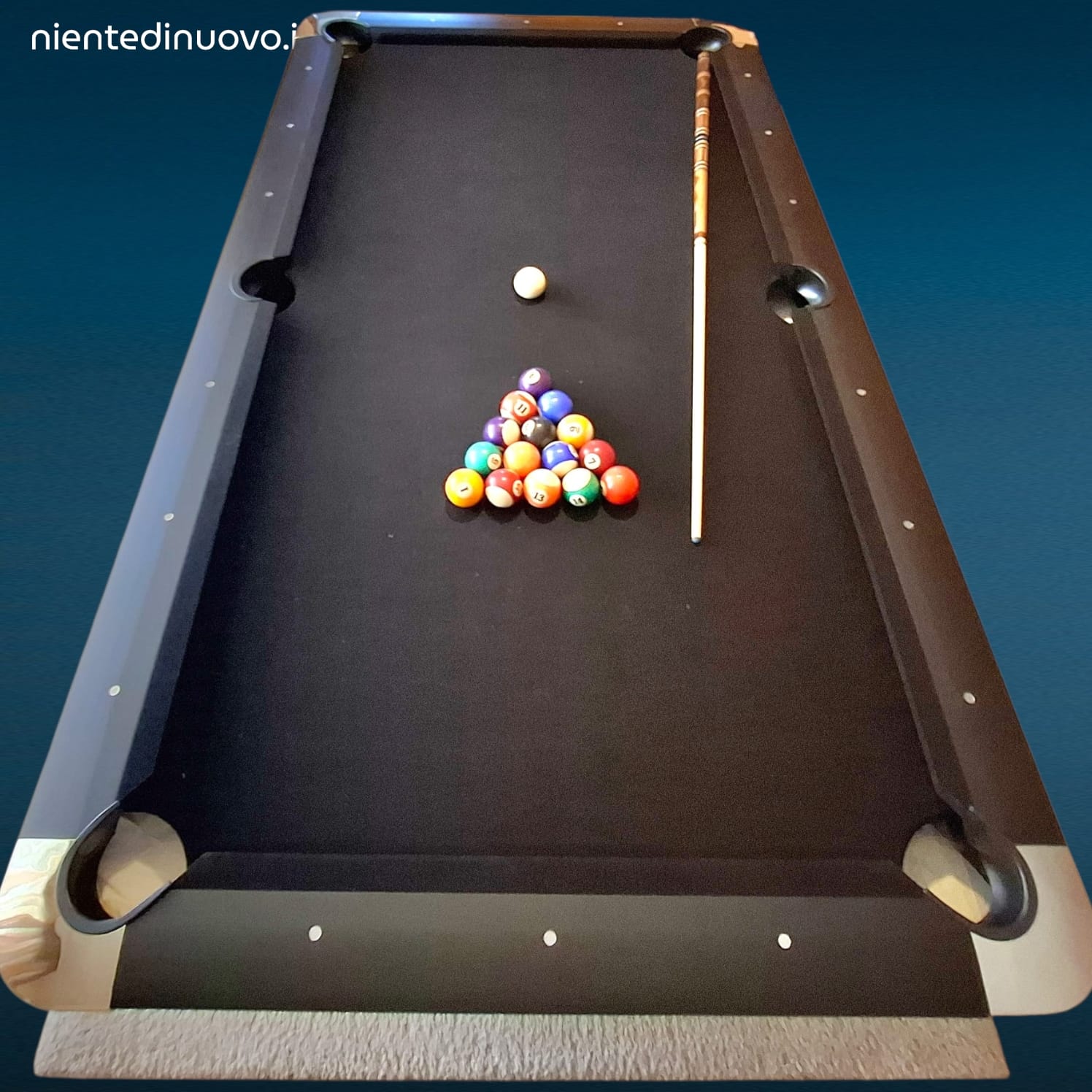 Il tappeto nero definisce con chiarezza l’aspetto del tavolo e contribuisce a un’estetica contemporanea. Inoltre, la fornitura comprende le biglie da carambola e una stecca, quindi il prodotto risulta già corredato degli elementi essenziali per l’utilizzo. Per questo motivo, può interessare sia chi desidera arredare uno spazio ricreativo, sia chi cerca un tavolo da gioco pronto all’uso senza accessori da reperire separatamente.
