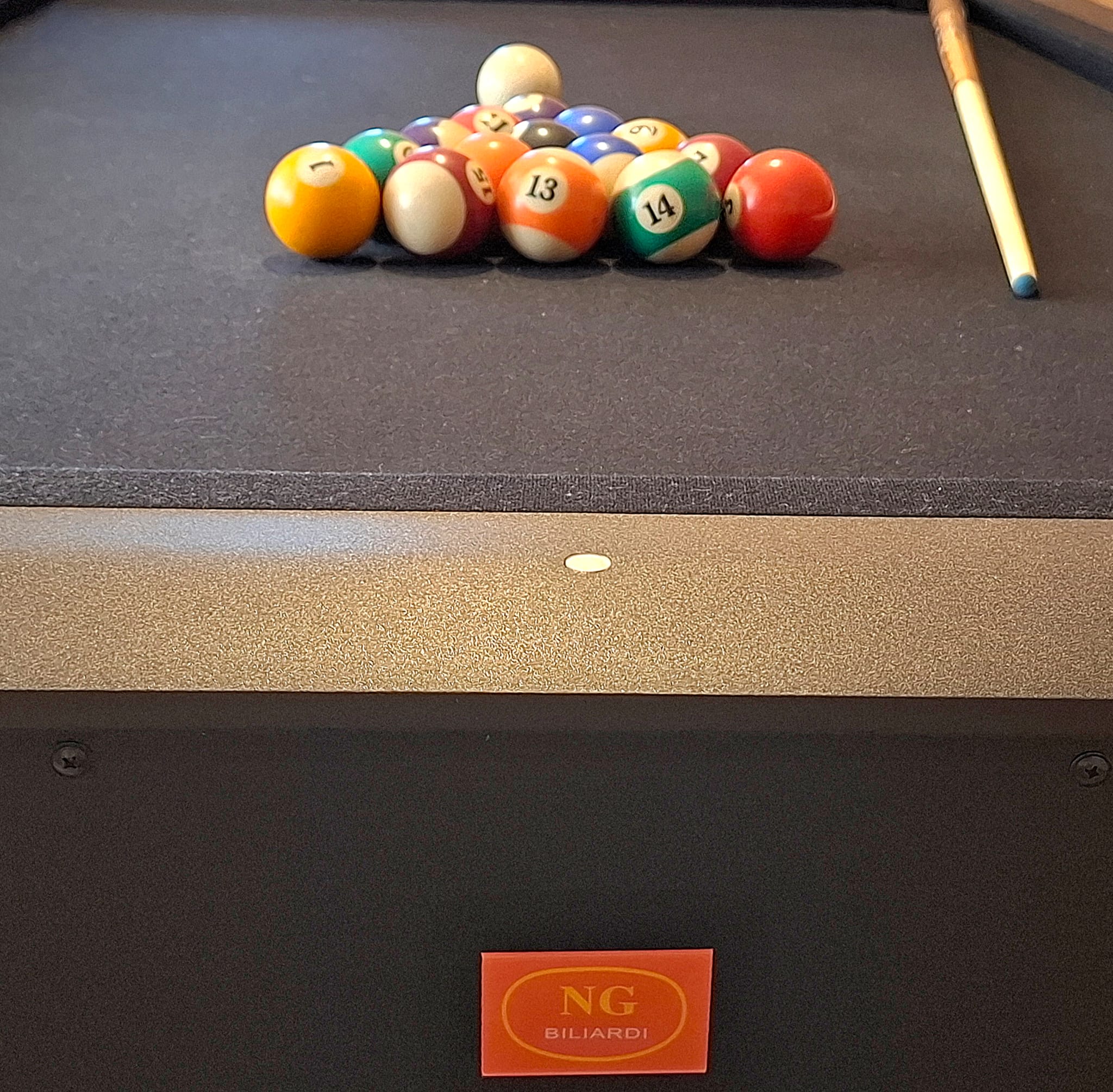 Tavolo da carambola di produzione moderna, adatto a contesti domestici come appartamento o taverna. Il modello, marchiato NG Biliardi, presenta tappeto nero, struttura in buone condizioni generali ed è completo di biglie da carambola e una stecca. Sono presenti un paio di segnetti dovuti all’uso, visibili nelle fotografie.