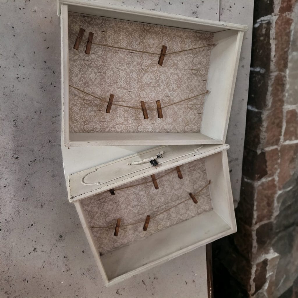 appariscente e simpatico cassetto in metallo decorato in stile provenzale ed utilizzato come mensola da appendere a parete,ideale per dare un tocco di originalità a qualsiasi ambiente.
