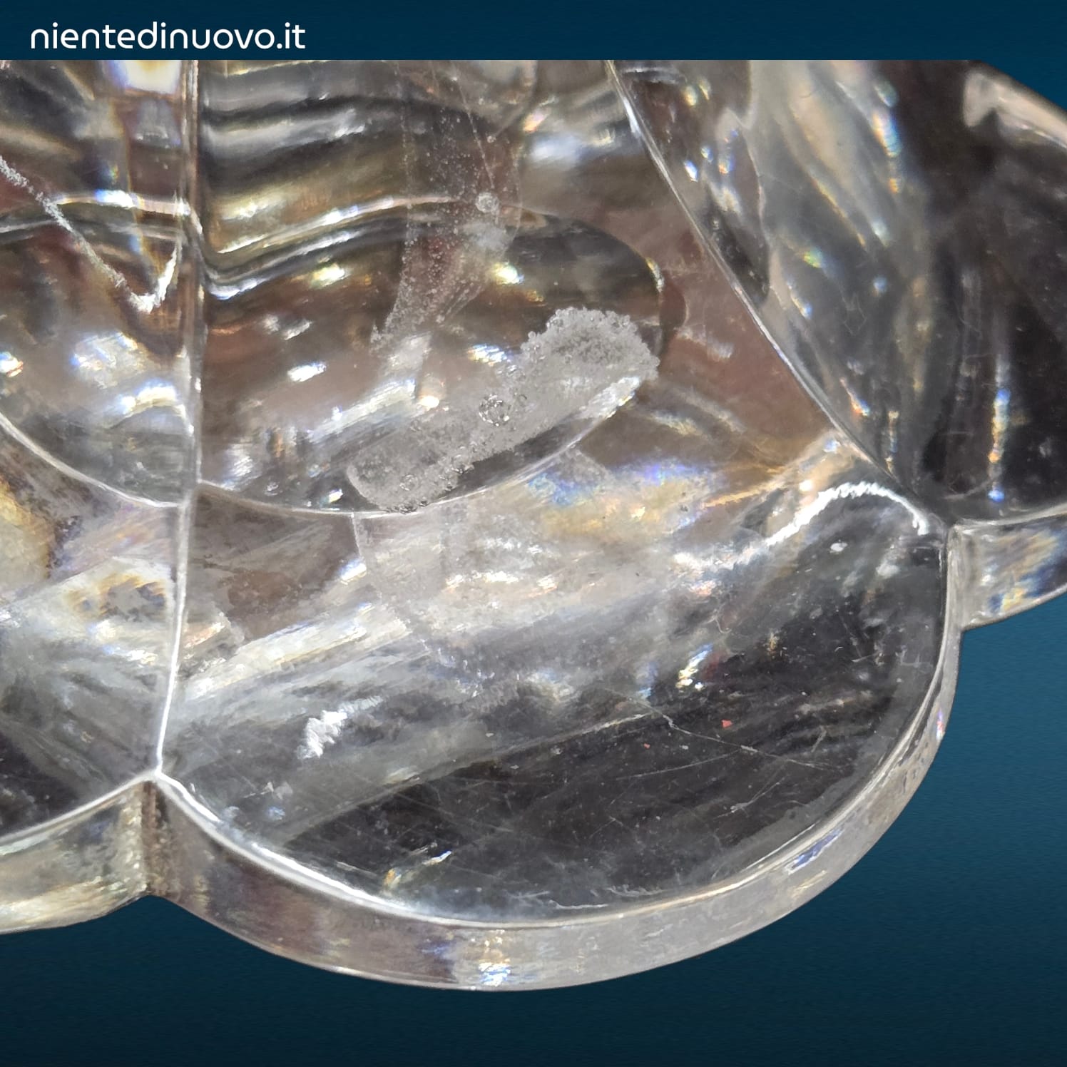 È presente tuttavia una particolarità da segnalare. All’interno della base di uno dei due candelabri si trova una piccola impurità interna nel cristallo. Questo dettaglio non compromette la stabilità o la funzionalità dell’oggetto, ma viene indicato per completezza descrittiva e trasparenza.