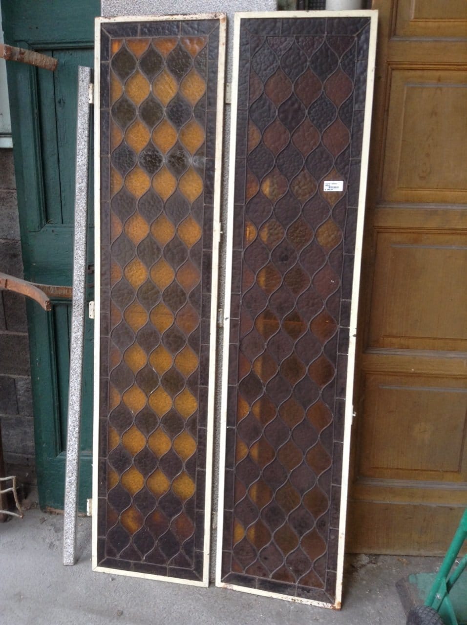 È importante segnalare che alcuni vetri risultano danneggiati, come evidenziato nelle fotografie allegate. Si tratta di una condizione comune per vetri originali dell’epoca, che non compromette il valore storico dell’oggetto ma anzi ne conferma l’autenticità. Le vetrate sono comunque integre nella loro struttura e perfettamente restaurabili per chi desidera riportarle al loro splendore originale.