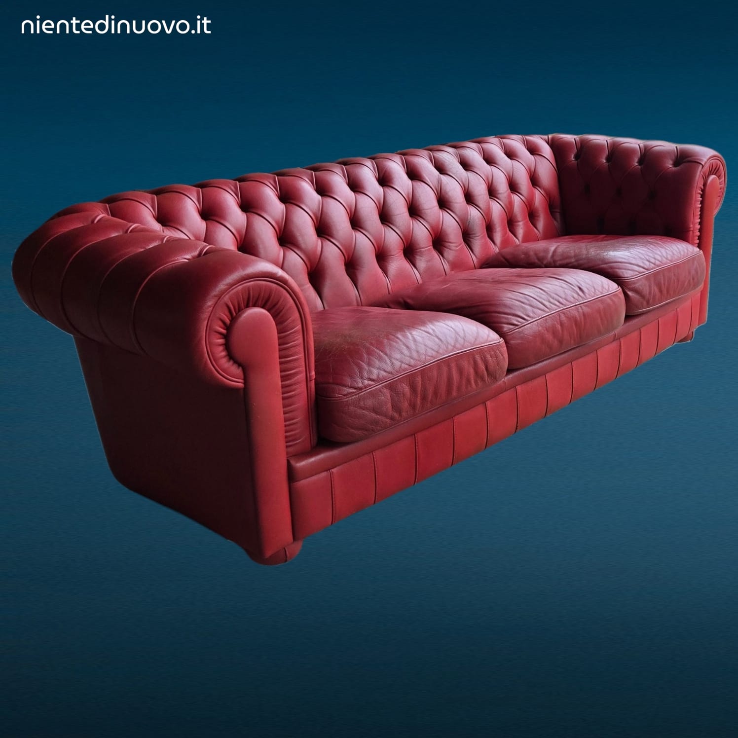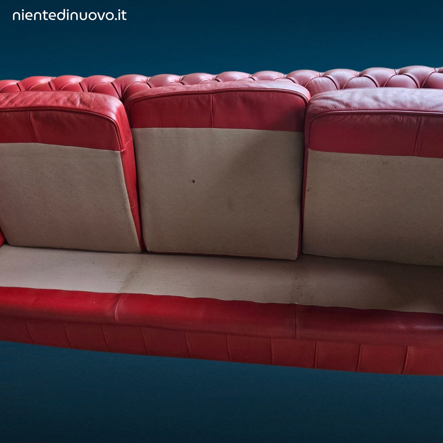 Divano usato a tre posti in stile Chesterfield inglese, modello club, rivestito in pelle rossa trapuntata. Struttura ben sostenuta e condizioni generali discrete, con normali segni di usura dovuti all’uso.