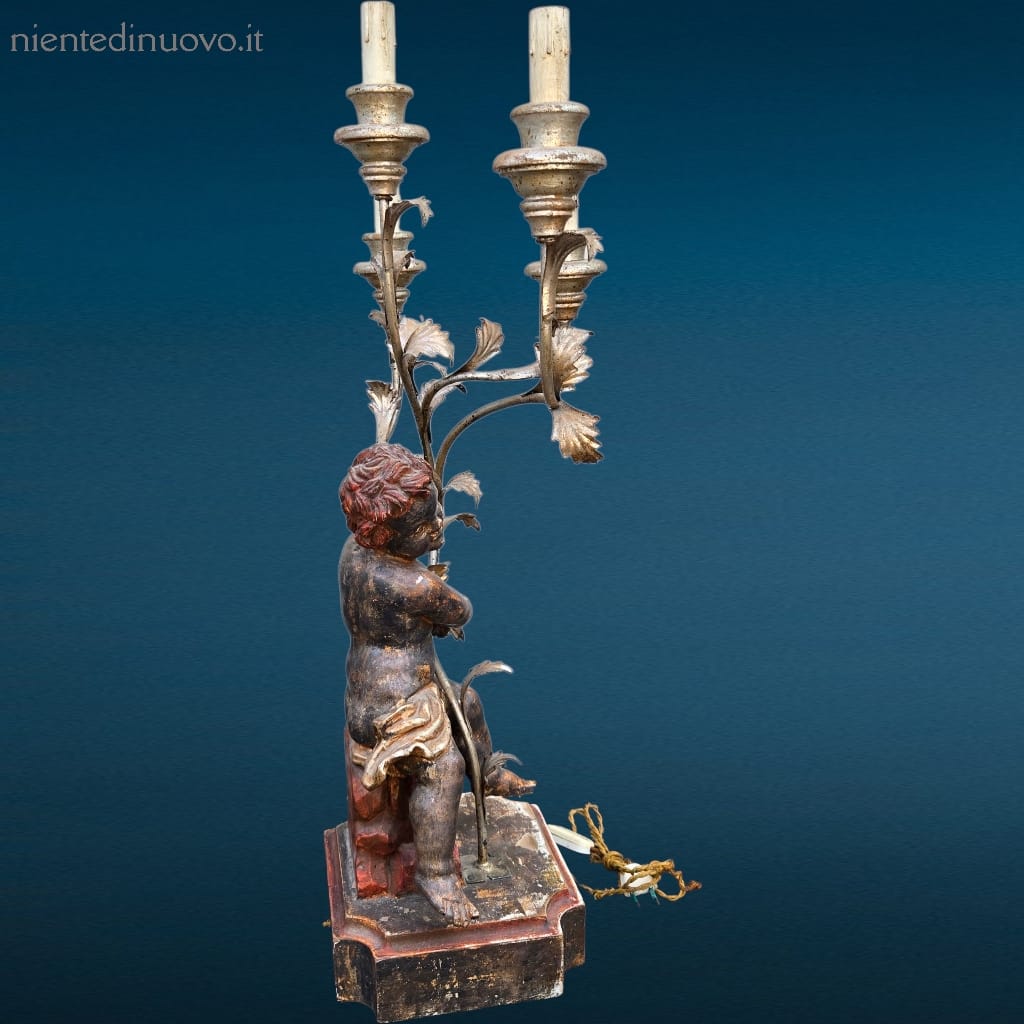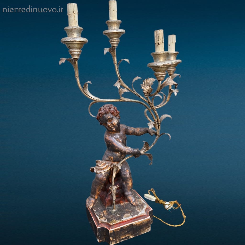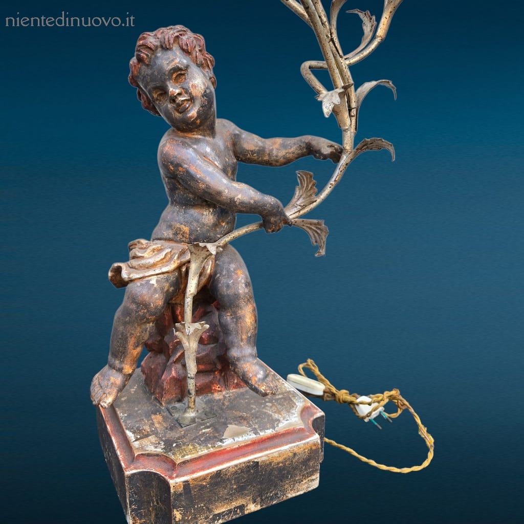 La Lampada da tavolo con putto in legno è un oggetto d’arredo dal fascino senza tempo, ideale per chi desidera impreziosire i propri ambienti con un tocco classico e romantico. Questa graziosa lampada d’epoca è composta da una figura scolpita di un puttino, finemente lavorata in legno, che sorregge un candeliere, creando un effetto scenografico elegante e delicato.