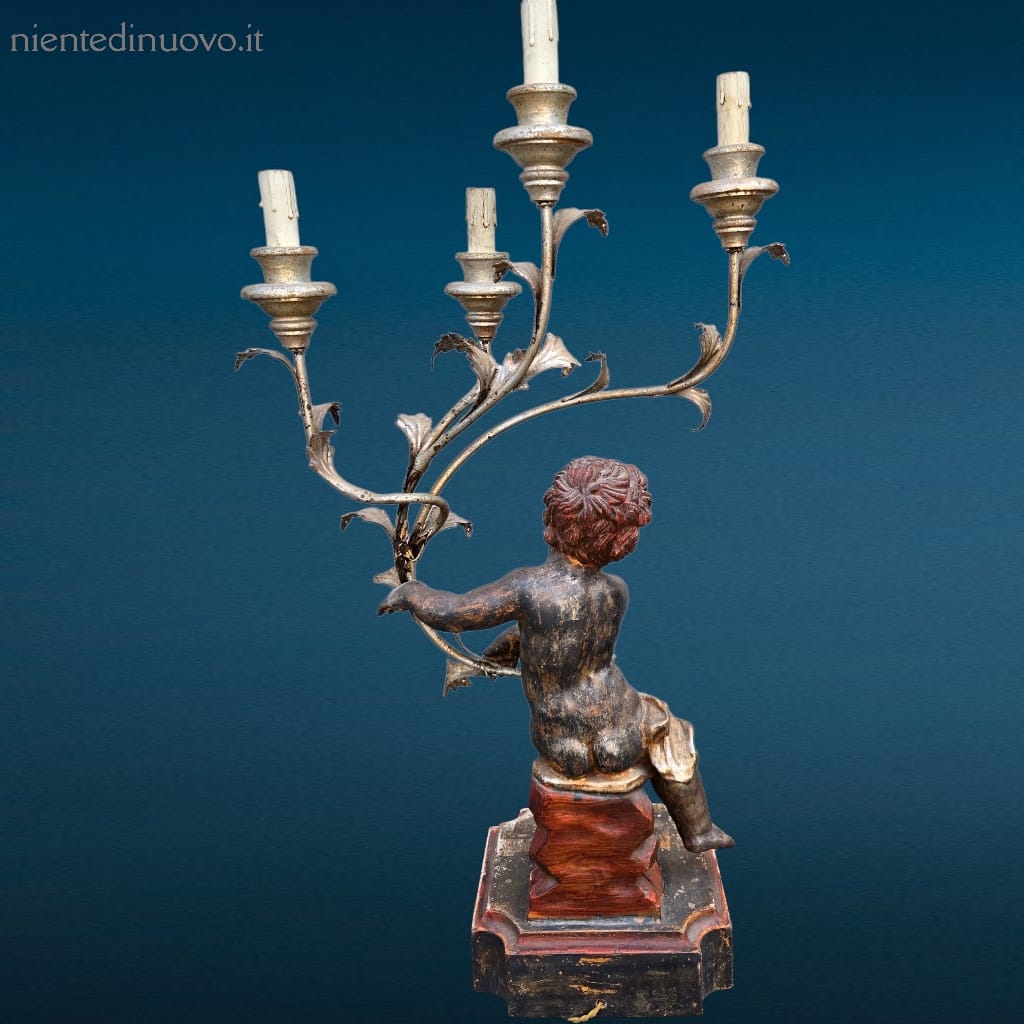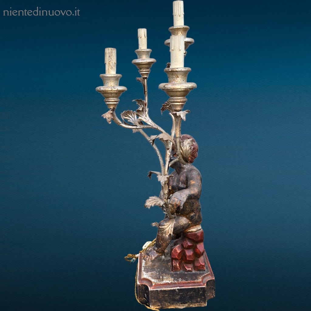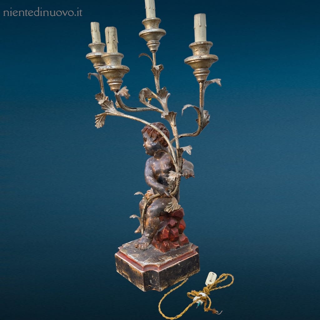 La Lampada da tavolo con putto in legno è un oggetto d’arredo dal fascino senza tempo, ideale per chi desidera impreziosire i propri ambienti con un tocco classico e romantico. Questa graziosa lampada d’epoca è composta da una figura scolpita di un puttino, finemente lavorata in legno, che sorregge un candeliere, creando un effetto scenografico elegante e delicato.