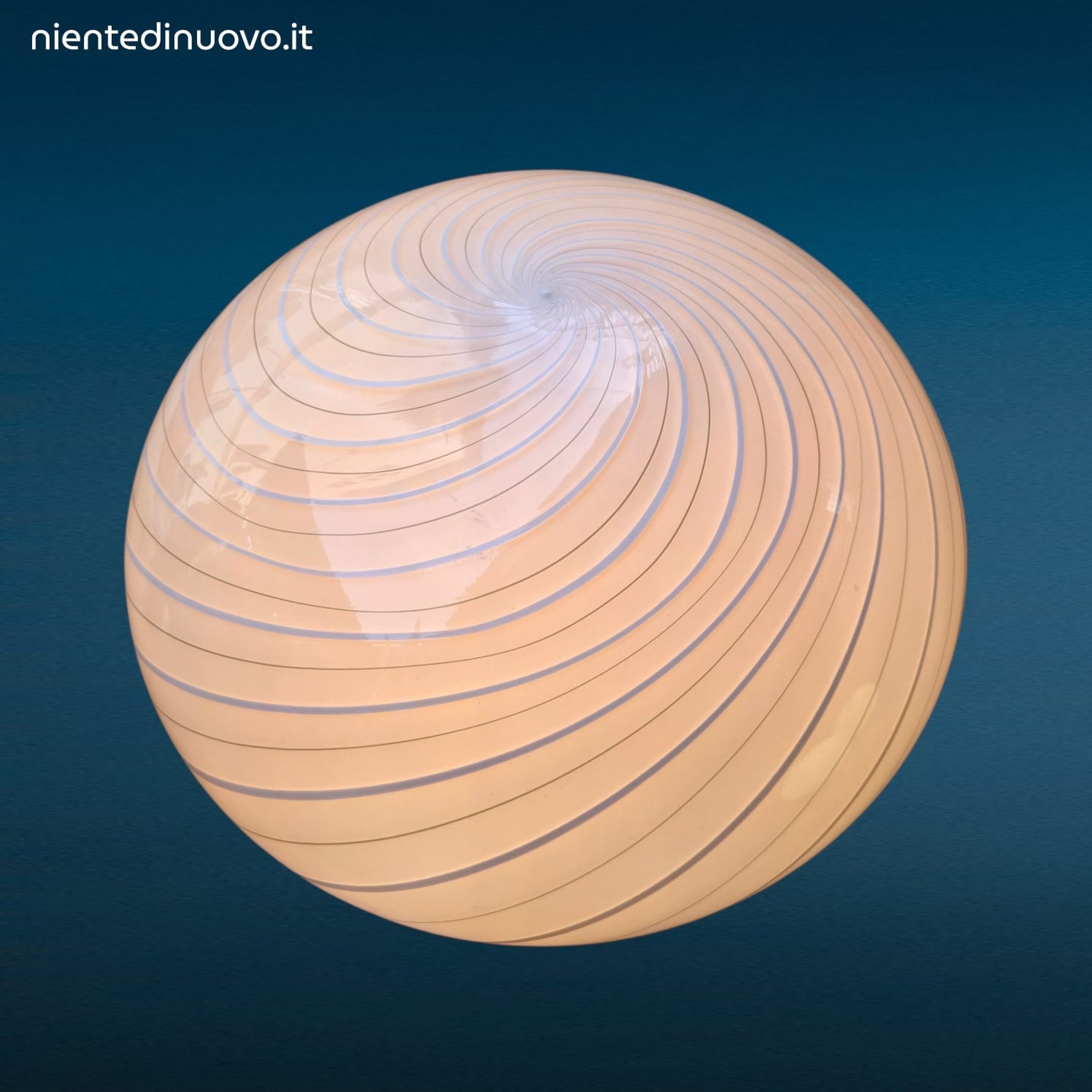 Realizzata in vetro di Murano, la lampada presenta una lavorazione a spirale che crea un effetto dinamico e tridimensionale. Quando è accesa, la luce attraversa il vetro e mette in evidenza le forme, generando un’illuminazione diffusa e avvolgente. Inoltre, il design richiama la tradizione artigianale italiana, mantenendo però una linea adatta anche a contesti più moderni.