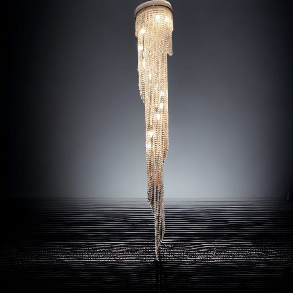 La sua struttura a spirale, realizzata con cristalli scintillanti, si snoda elegantemente verso il basso, creando una cascata di luce e brillantezza senza pari. Ogni singolo cristallo è lavorato con maestria per catturare e riflettere la luce in un’esplosione di colori e sfumature, diffondendo una magica atmosfera di calore e comfort.
