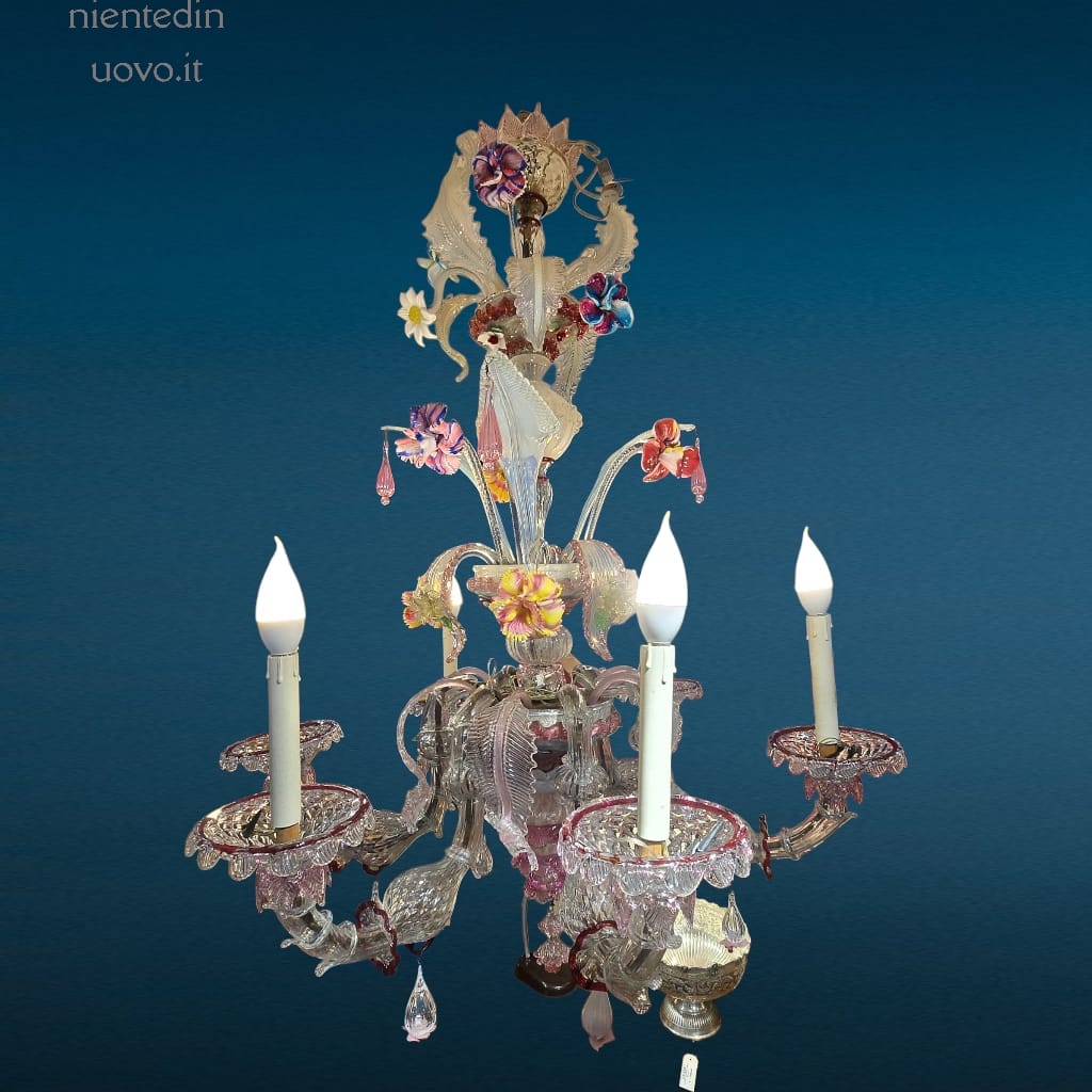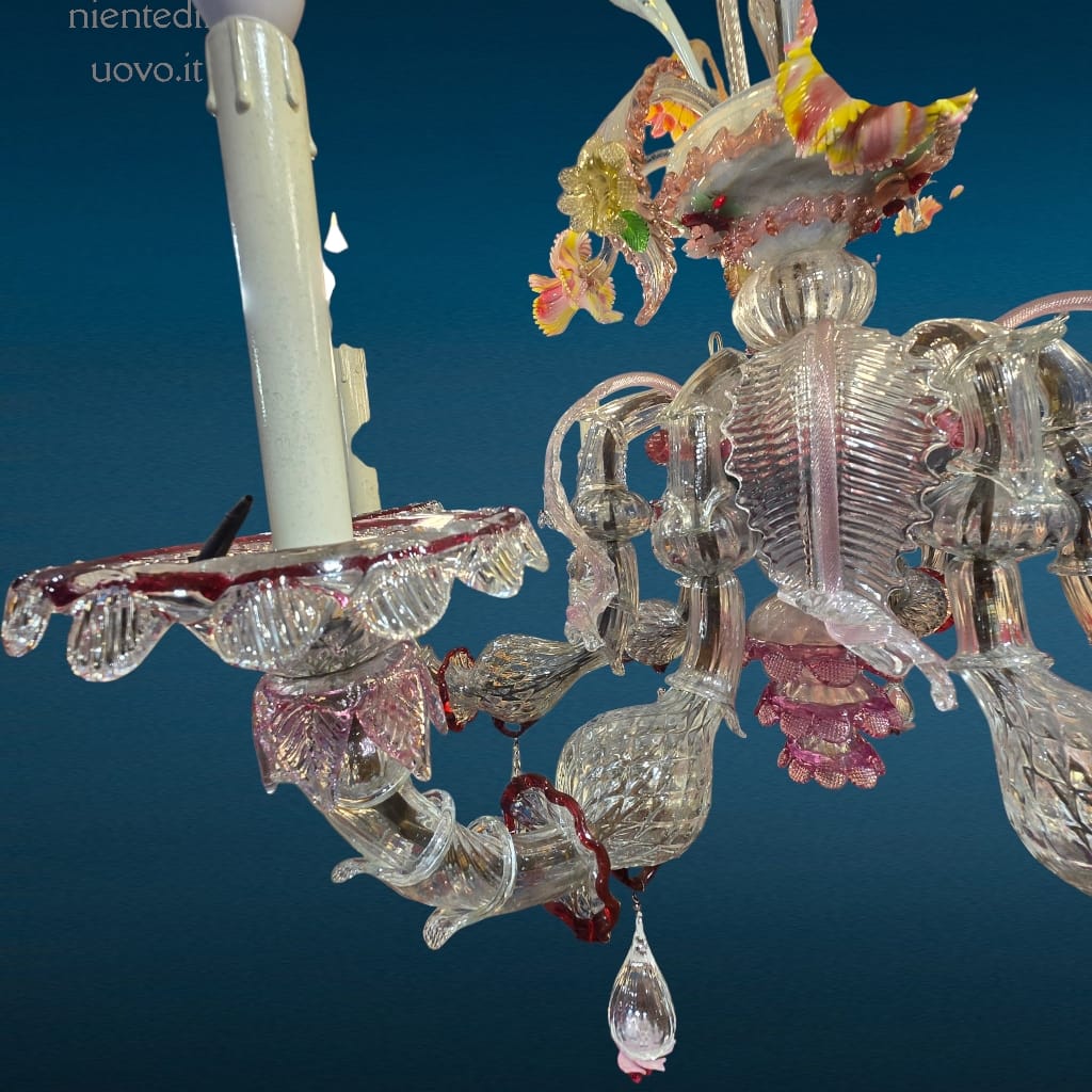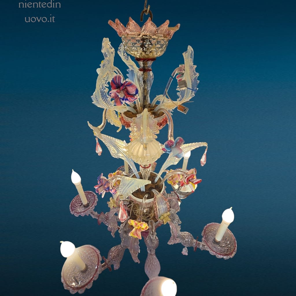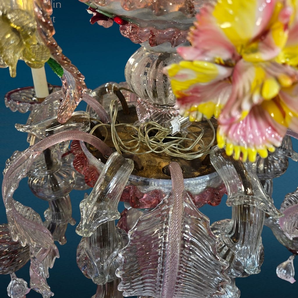 Dotato di 6 punti luce con attacco E14, il lampadario offre una perfetta illuminazione per ambienti eleganti e raffinati. Ogni braccio e ogni elemento decorativo è stato realizzato artigianalmente a Murano, evidenziando fiori colorati, foglie sagomate e dettagli ricercati che ne esaltano il valore artistico. L’intero impianto elettrico è funzionante e integro, un dettaglio importante che garantisce sicurezza e praticità.