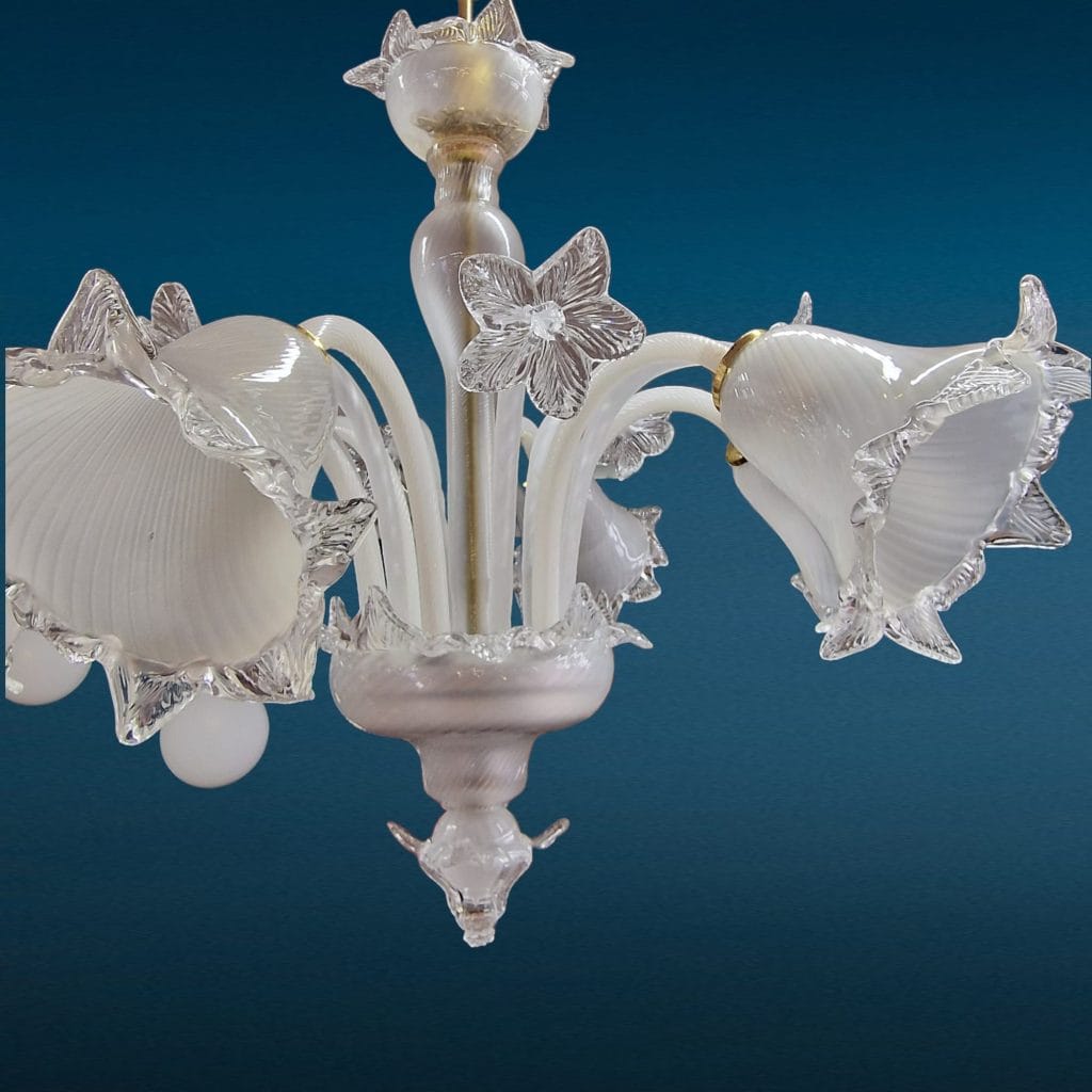 splendido vecchio lampadario veneziano di Murano a 6 luci in vetro chiaro satinato con fiori perfettamente integro in tutte le sue parti e completo.