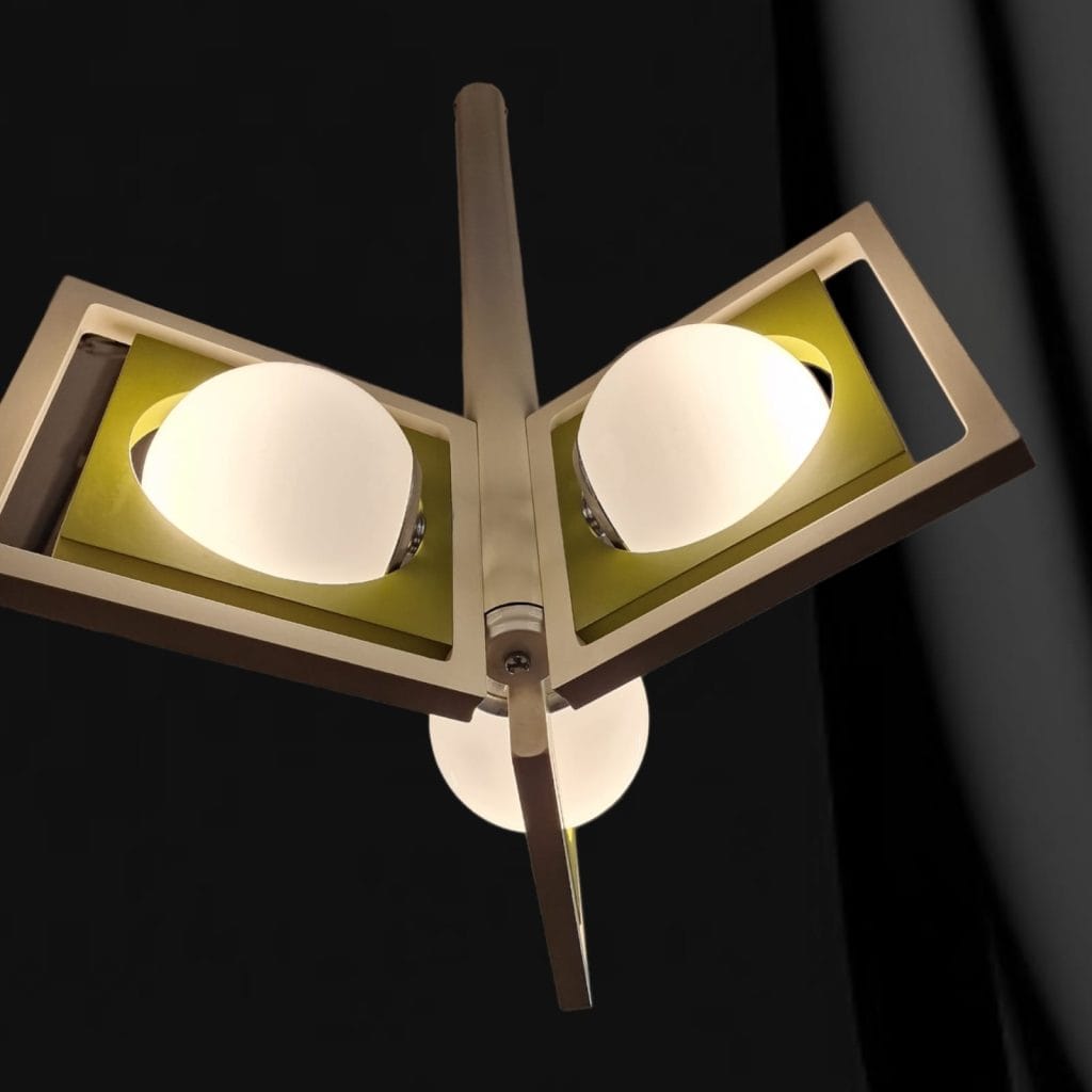 appariscente lampadario vintage a tre luci con 3 sfere in vetro opalino montate ed incastonate su una struttura in legno laccato retta da un palo centrale .E’ stato interamente ripulito e ricontrollato nell’impianto elettrico.
