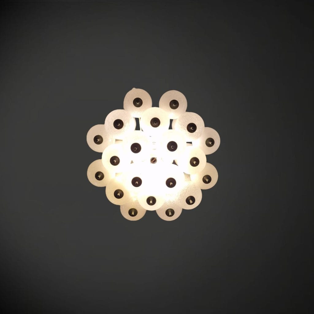 spettacolare lampadario vintage risalente agli anni 60/70 di particolare rarità, realizzato dalla ditta Olandese Raak su struttura in metallo che regge 28 palle in vetro del diametro di 8 cm, montate con sapienza a formare un particolare piacevole grappolo. all’interno della struttura vi sono 4 portalampada e14 .