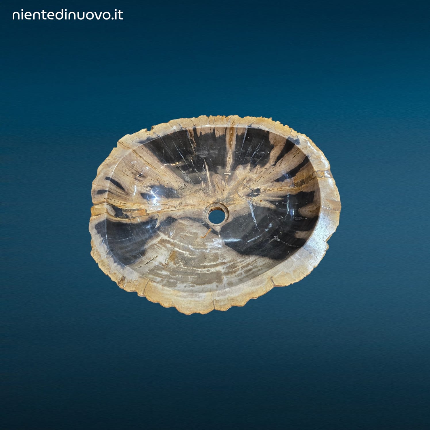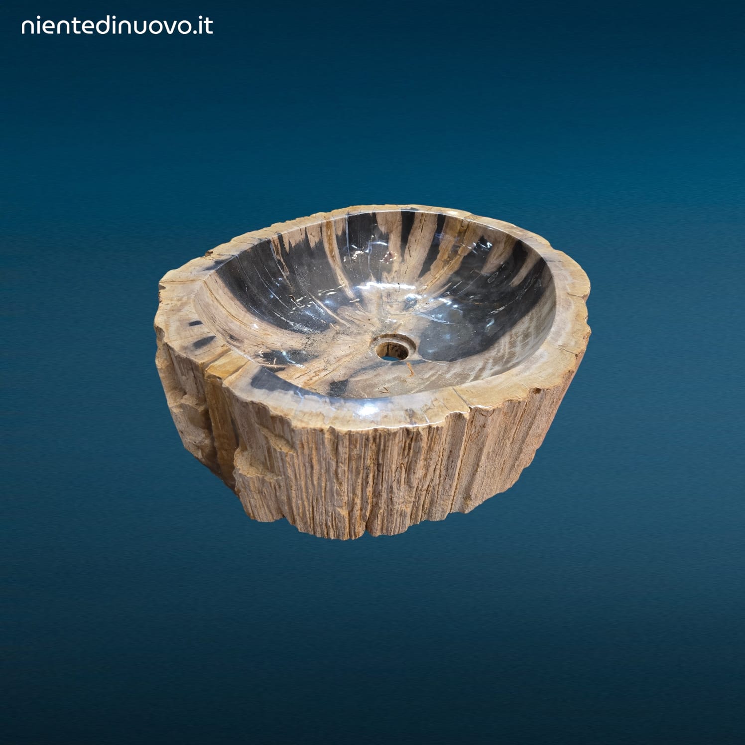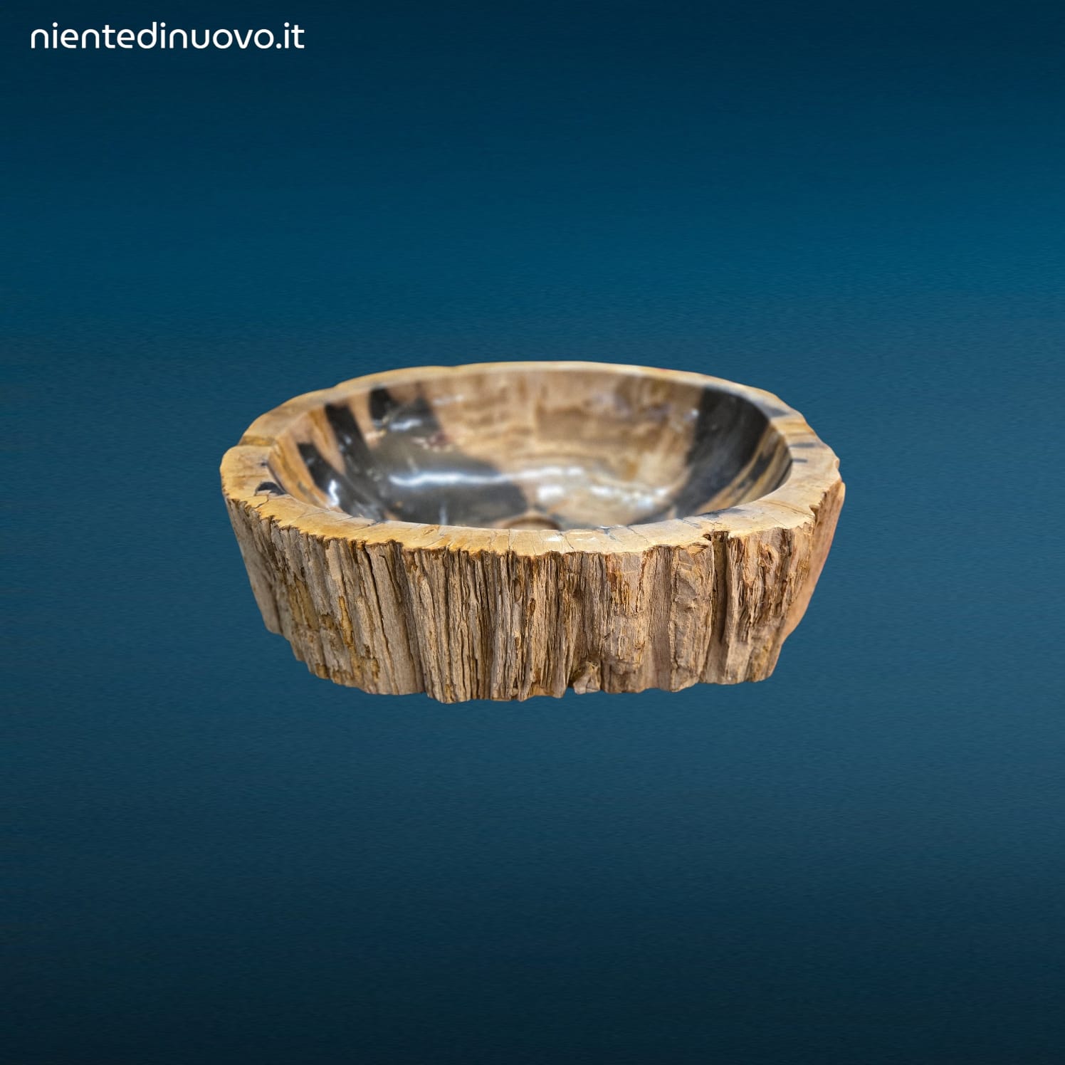 Lavandino in legno fossile pietrificato, misura ampia, con foro scarico e pronto per montaggio ad appoggio. Elegante, unico e 100% naturale.