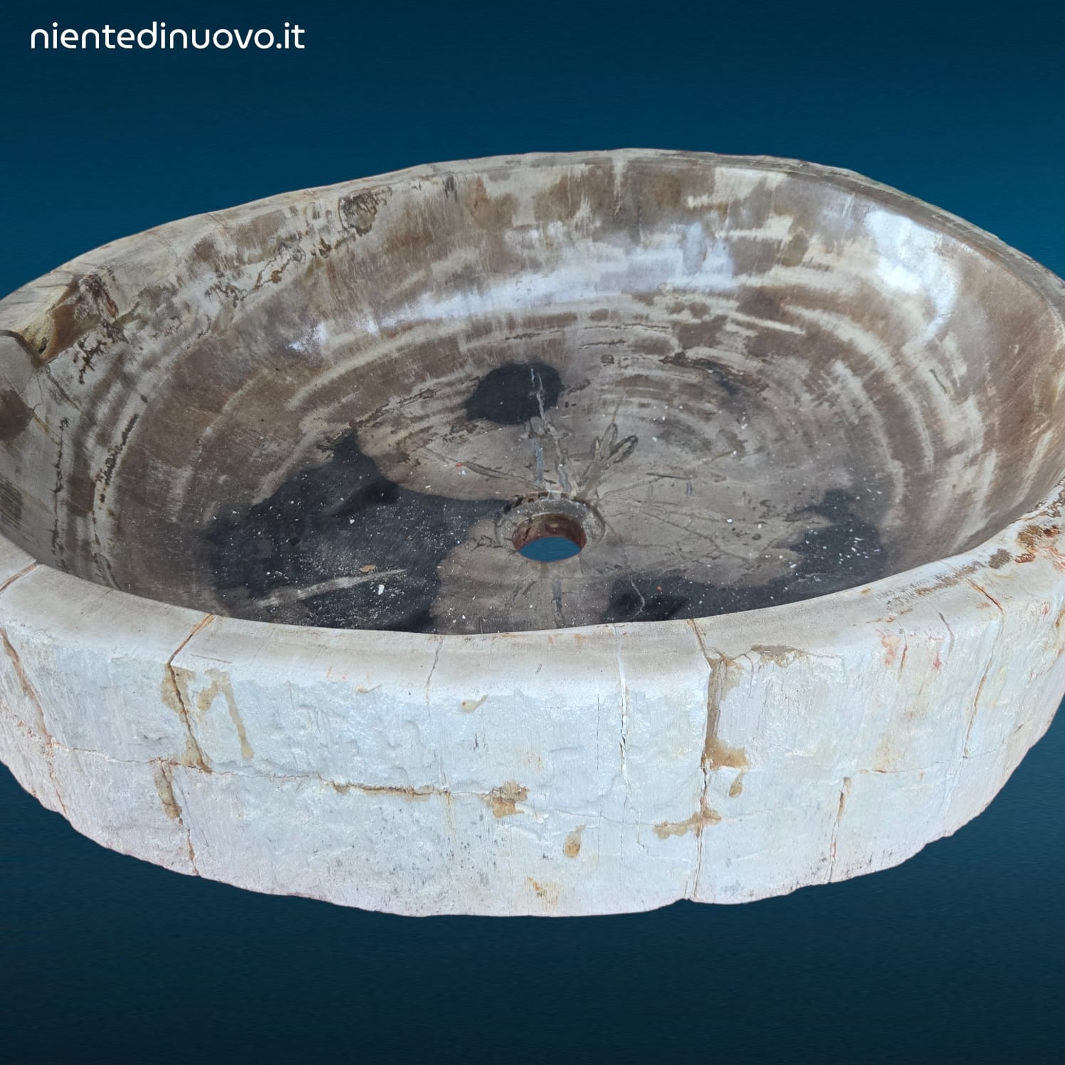 Lavandino da appoggio di grandi dimensioni ricavato da tronco in legno fossile pietrificato, formato attraverso un processo naturale di mineralizzazione durato milioni di anni. Elemento d’arredo contemporaneo in materiale fossile naturale, caratterizzato da struttura solida e venature minerali uniche. Superficie compatta e resistente, in ottimo stato di conservazione.