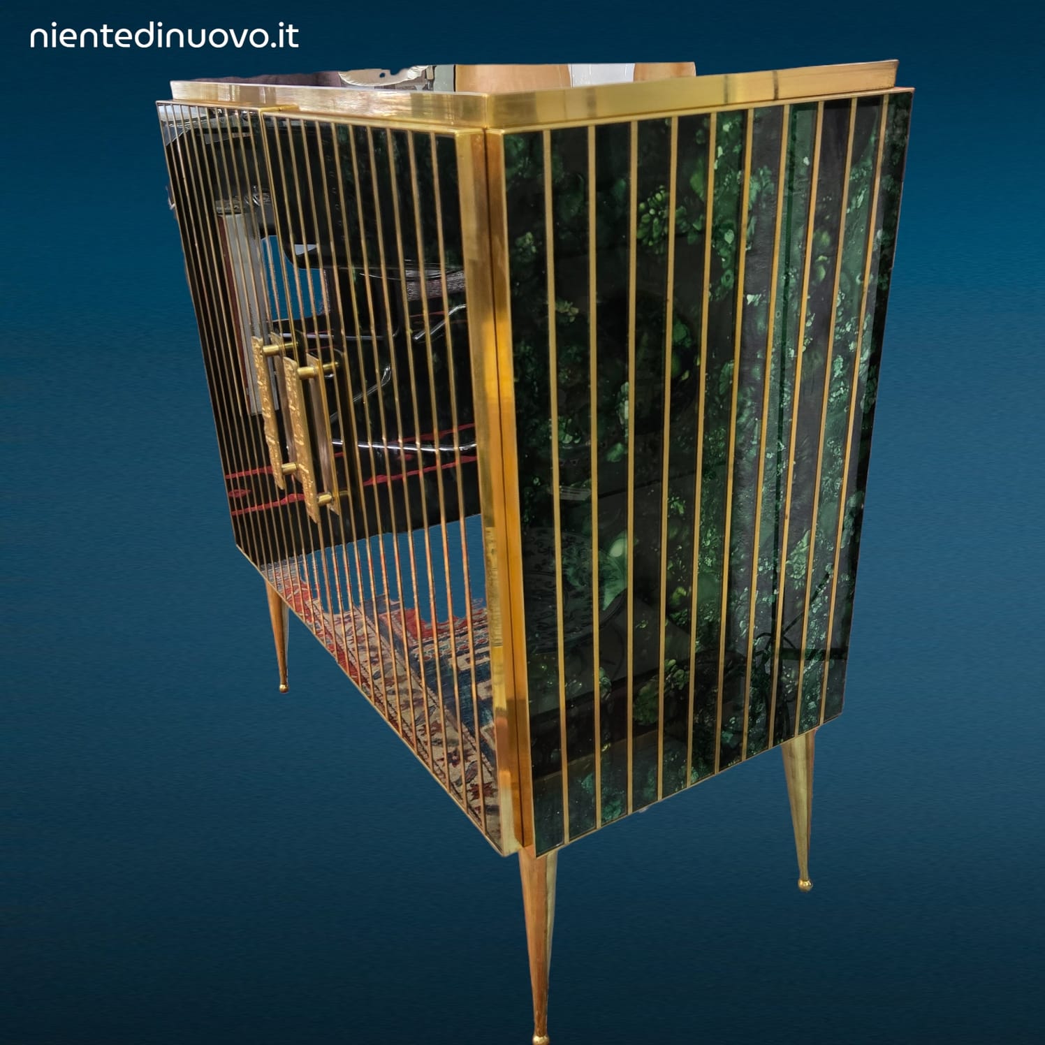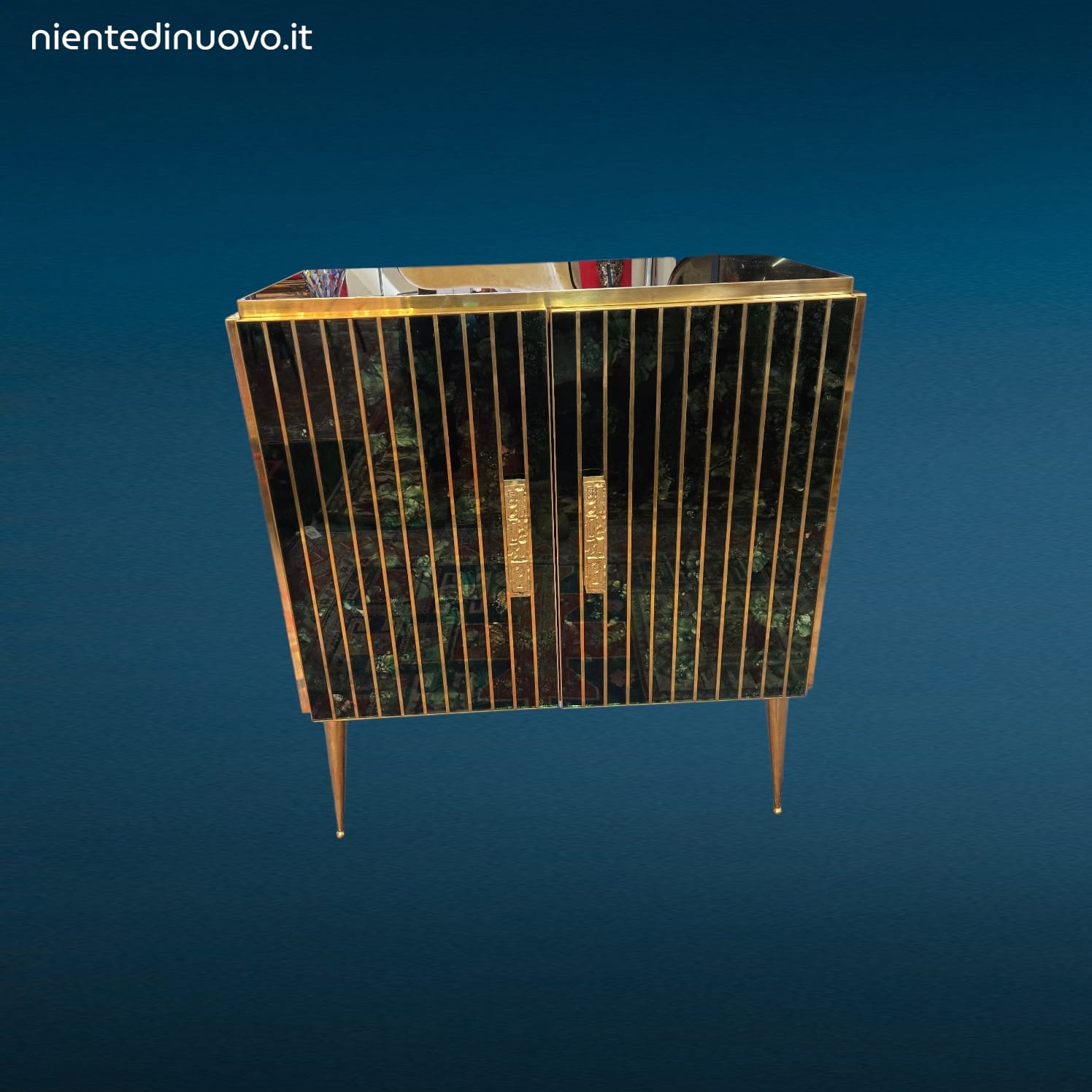 Mobile bar vintage a due ante in vetro di Murano, con filettature in ottone e maniglie in bronzo a cera persa. Eleganza e artigianato italiano.