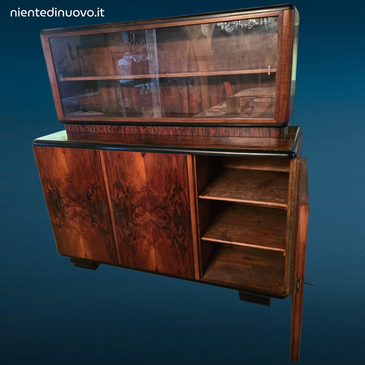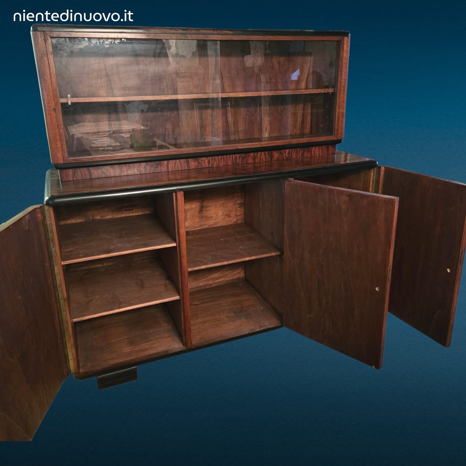 Caratteristiche principali: mobile a tre ante con radica, vetrina superiore a due ante scorrevoli, buone condizioni generali con due piccole mancanze di rivestimento sul lato sinistro del ripiano