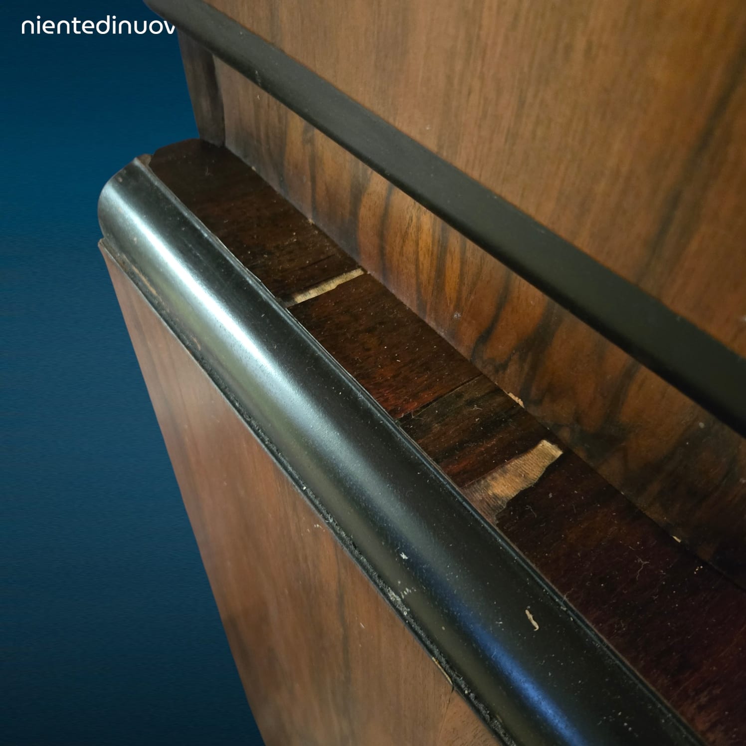 Il rivestimento in radica, particolarmente prezioso e ricercato in questo tipo di arredamento, conferisce al mobile un aspetto caldo e materico. Nonostante l’età, il pezzo si presenta in buone condizioni generali, mantenendo intatta la sua solidità strutturale. Si segnala soltanto la presenza di due piccole mancanze di rivestimento sul ripiano laterale sinistro, come da documentazione fotografica allegata.