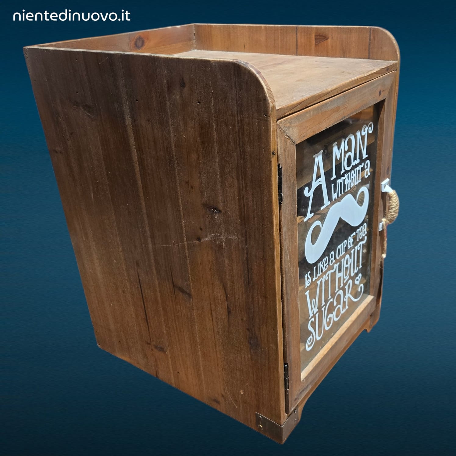 Questo mobiletto in legno rappresenta una soluzione pratica e compatta per organizzare piccoli oggetti all’interno di ambienti domestici o professionali. Prodotto in epoca contemporanea, si colloca nel filone del design funzionale, pensato per coniugare estetica e praticità. L’elemento si caratterizza per la struttura in legno naturale con finitura opaca e per la presenza di un’anta in vetro decorata con una scritta centrale, dal gusto moderno.