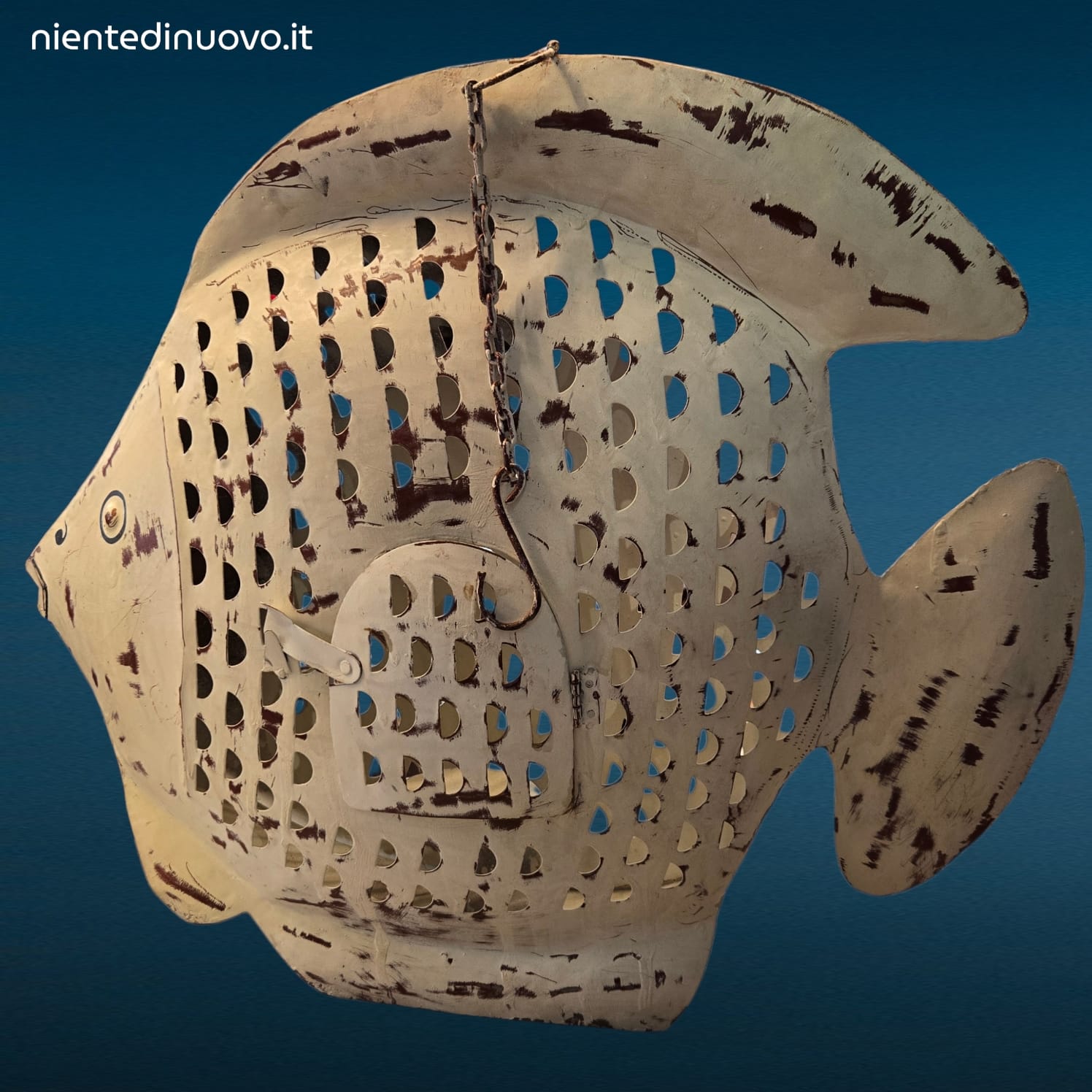 Il pesce bianco antico è dotato anche di una catena superiore. Di conseguenza, può essere appeso a parete, a una trave o a un supporto dedicato. In alternativa, può essere utilizzato come elemento decorativo da appoggio su mobili o consolle.
