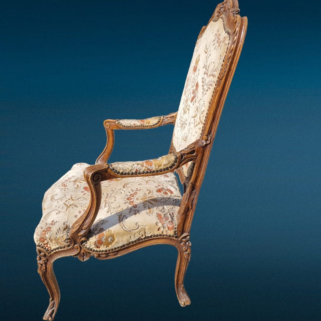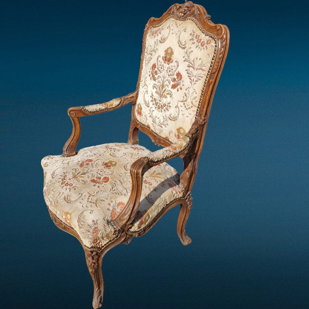 vecchia e robusta poltrona bergere con struttura in buone condizioni e rivestimento in velluto damascato