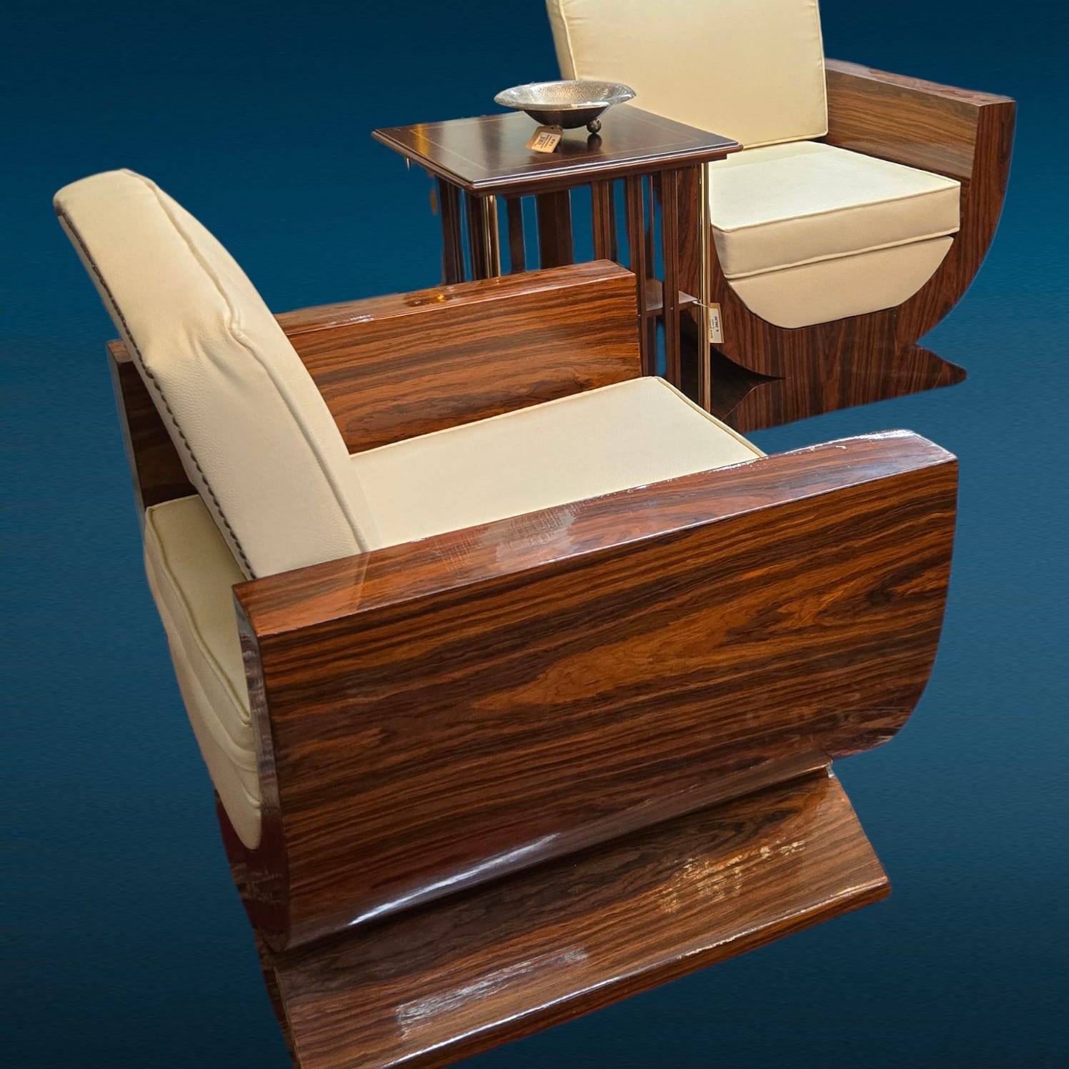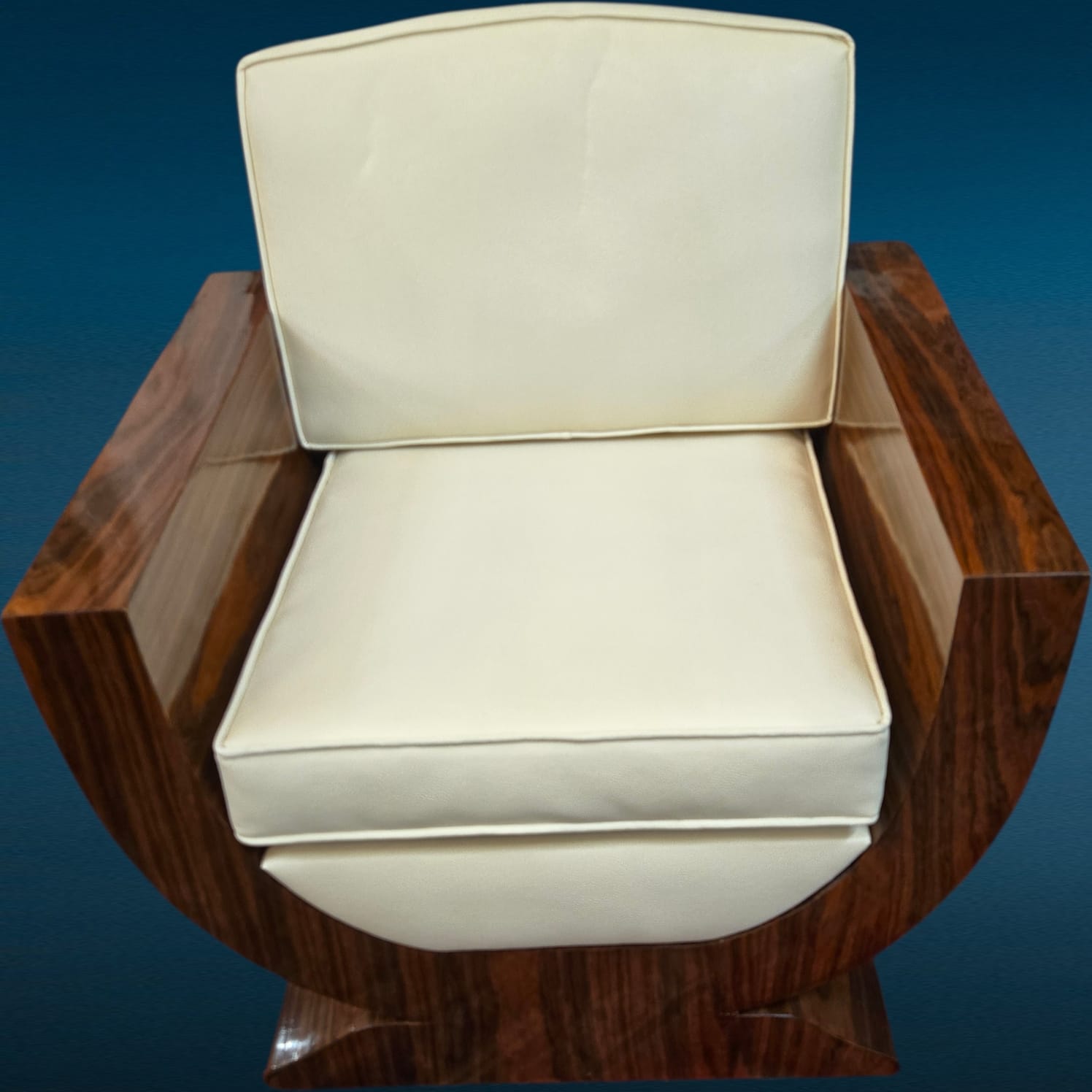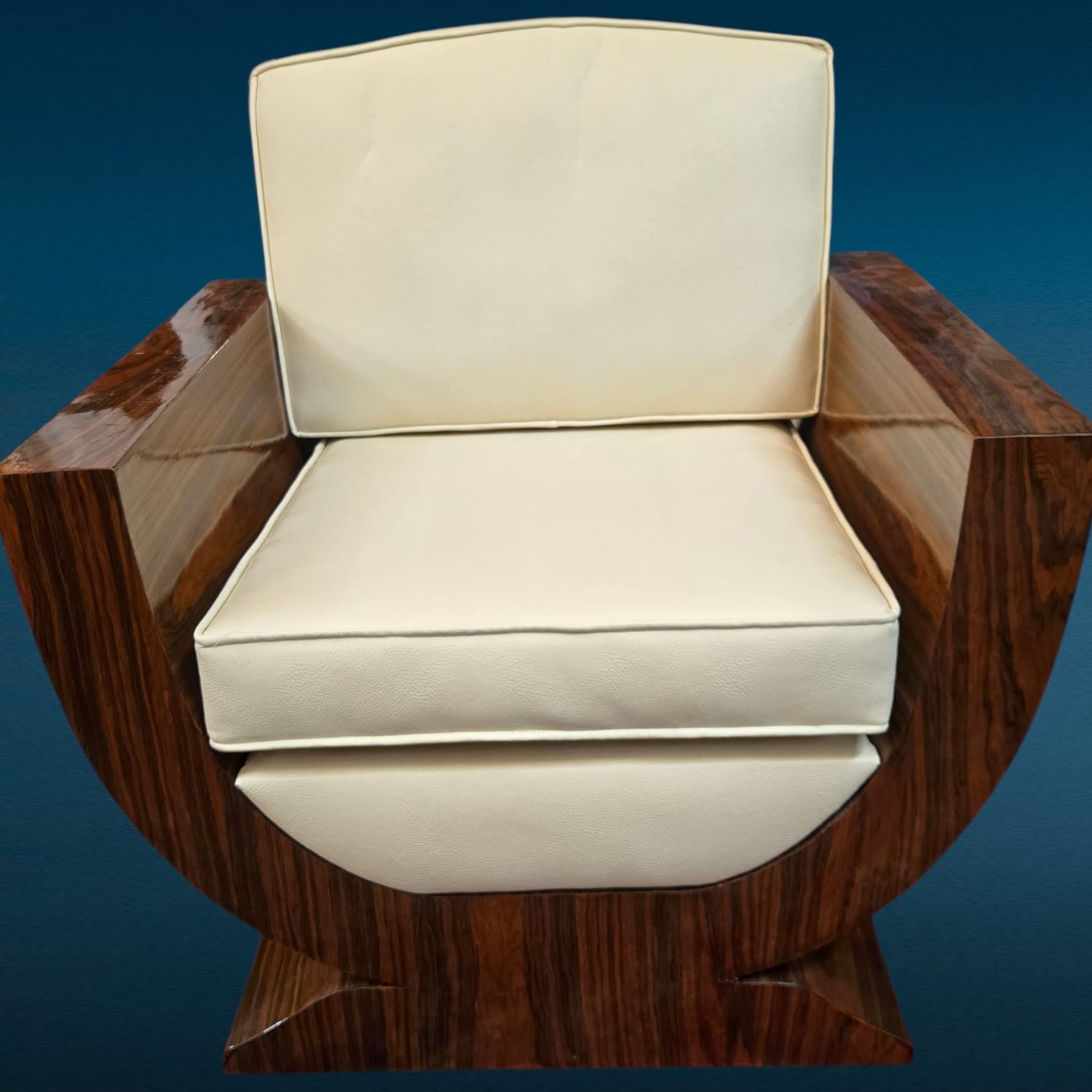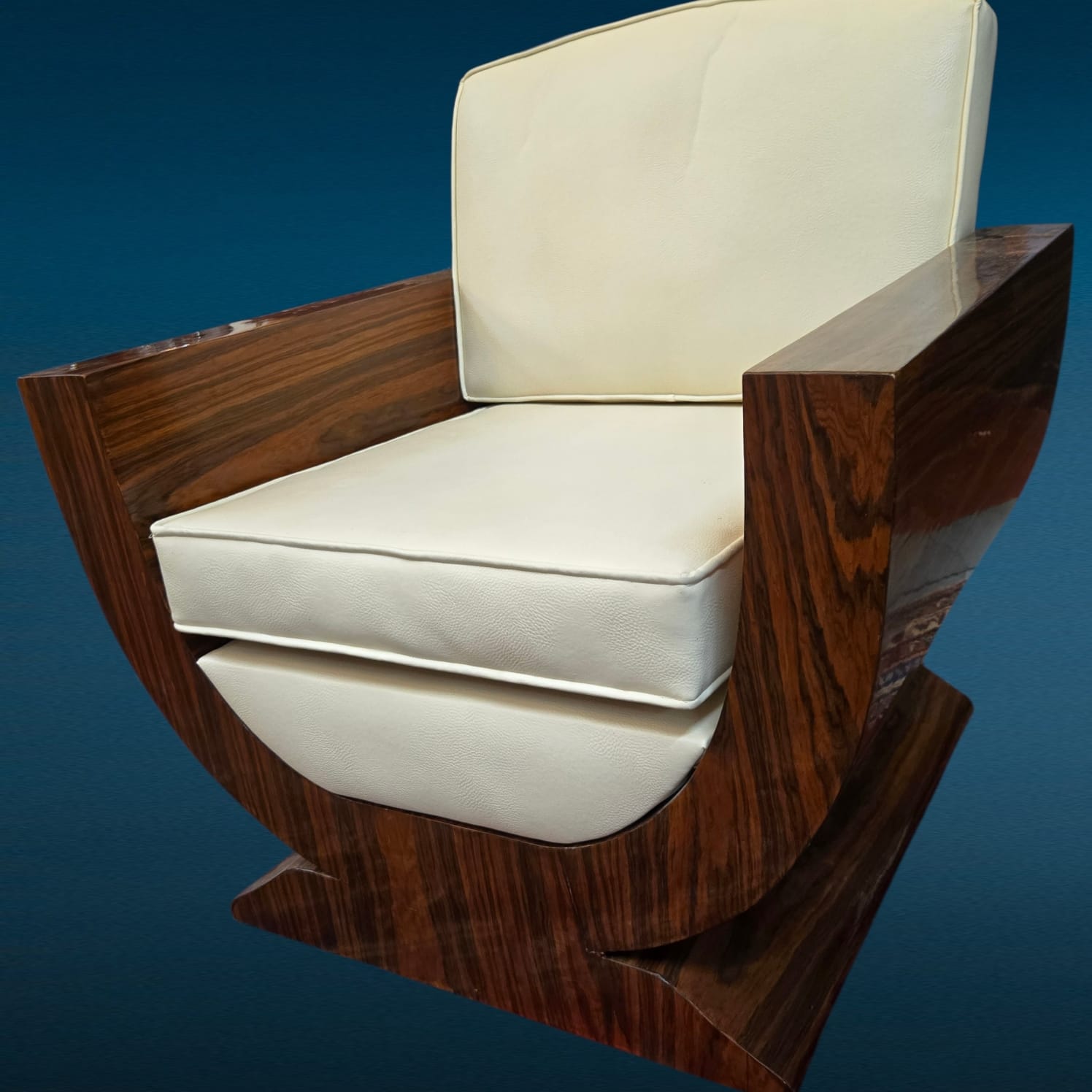 Questa poltrona Decò con braccioli in legno riprende le linee tipiche degli anni Trenta, con volumi compatti e dettagli che richiamano l’estetica elegante del periodo. Pur trattandosi di una produzione moderna, il disegno richiama lo stile Decò attraverso l’uso del legno radicato lucido e delle forme equilibrate.