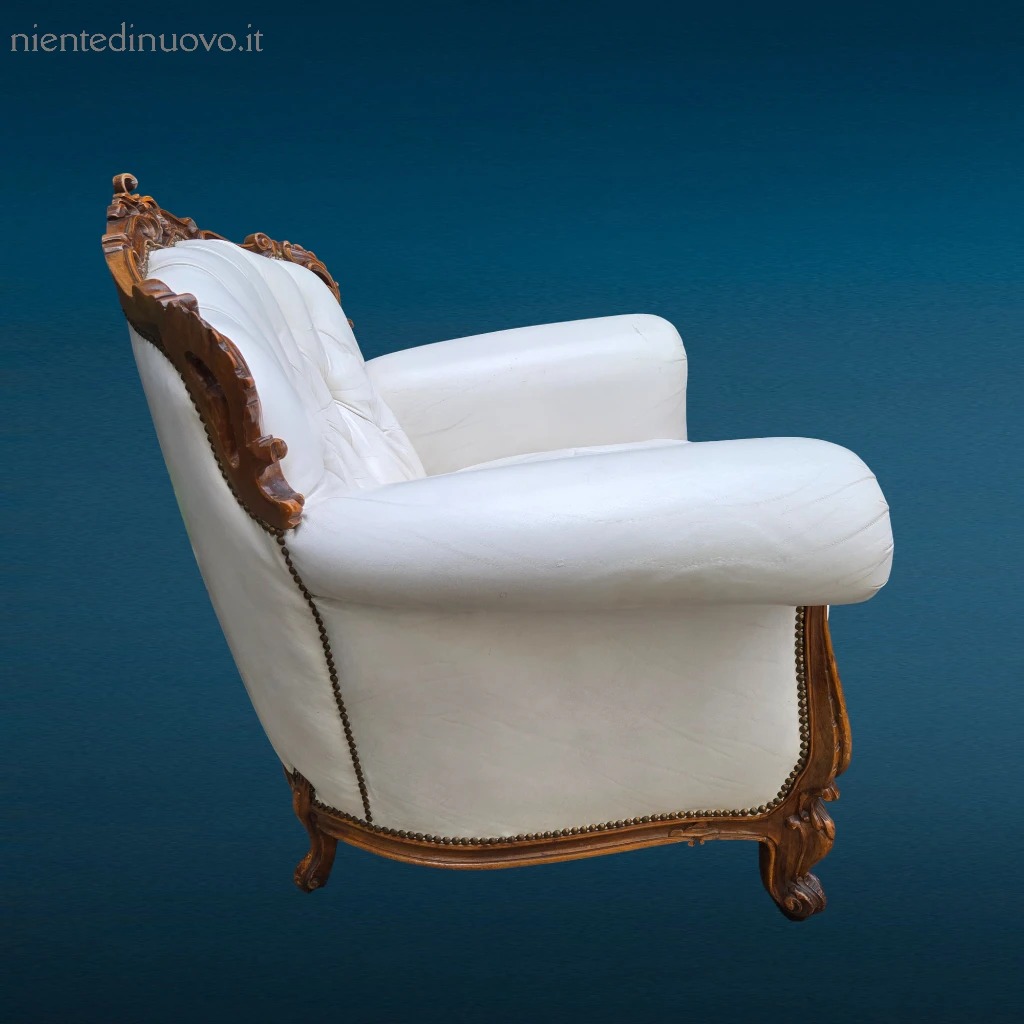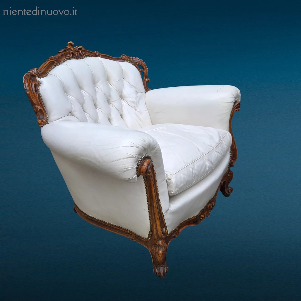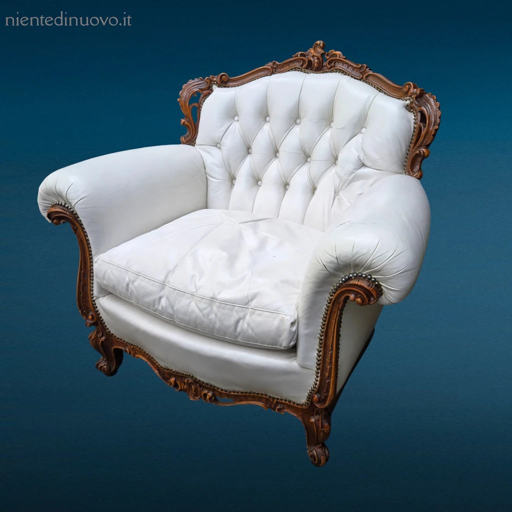 Poltrona in pelle bianca con cuscino in vera piuma d’oca e schienale capitonné. Prezzo ribassato per piccoli difetti estetici. Eleganza e comfort autentico.