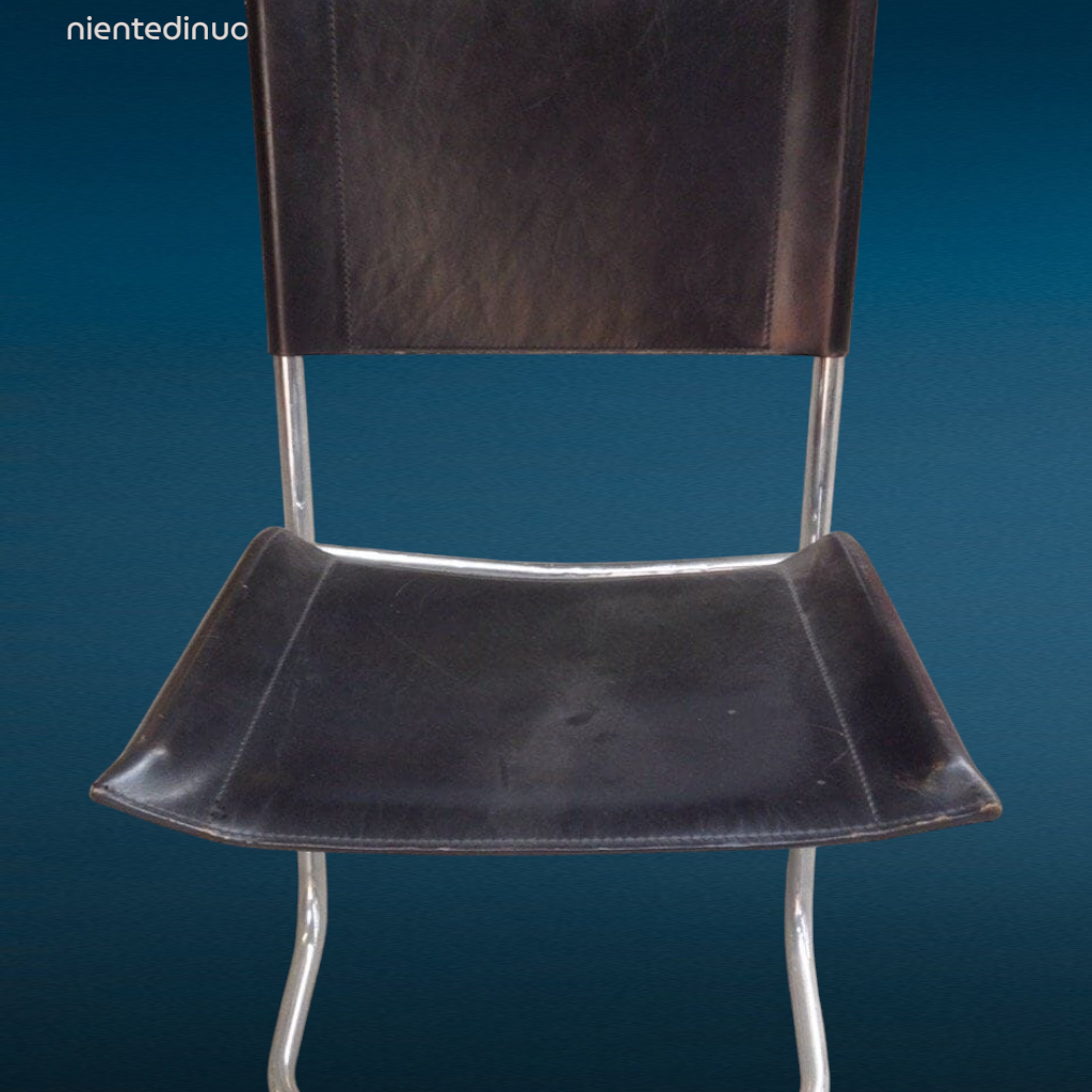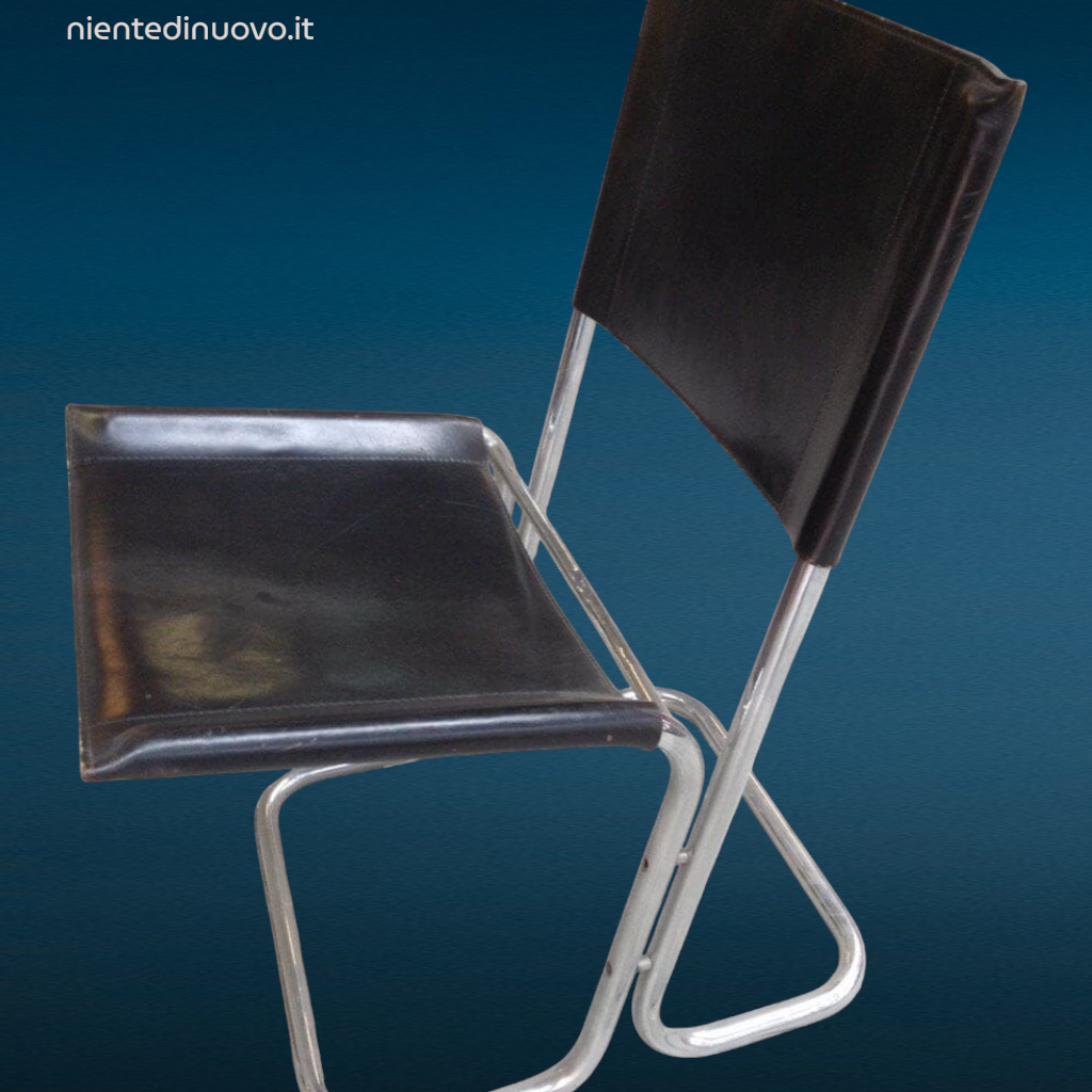 Poltroncina vintage anni ’70 in acciaio cromato con seduta in cuoio nero. Originale, comoda e con segni d’uso coerenti con l’età.