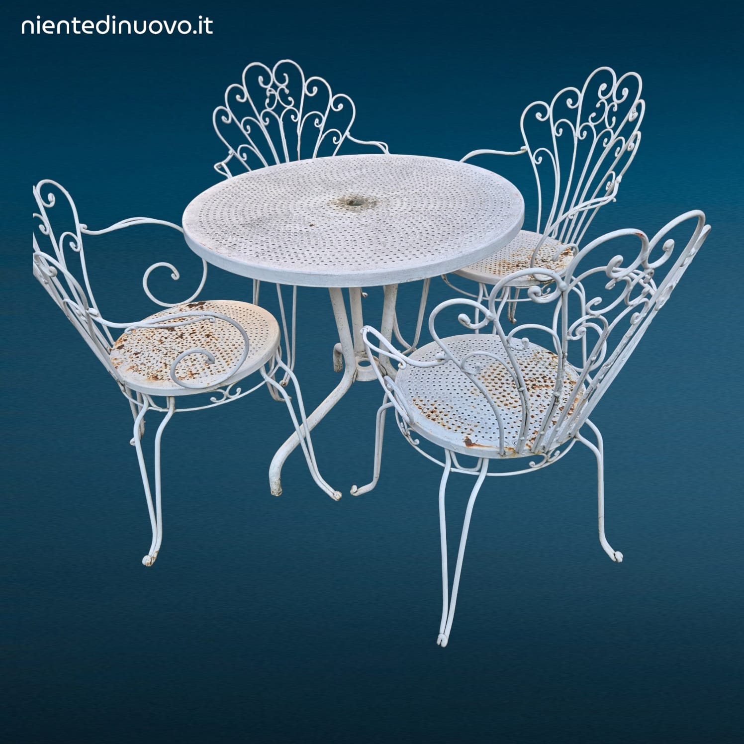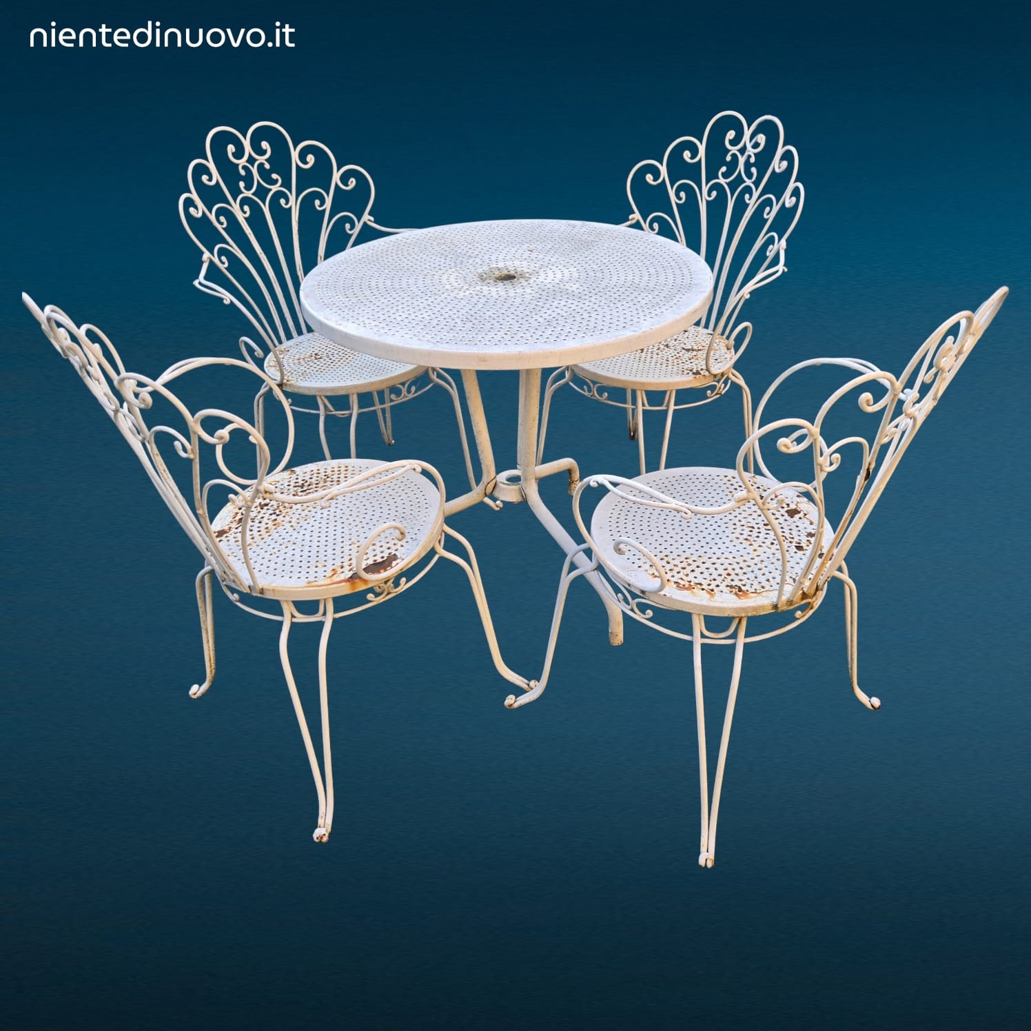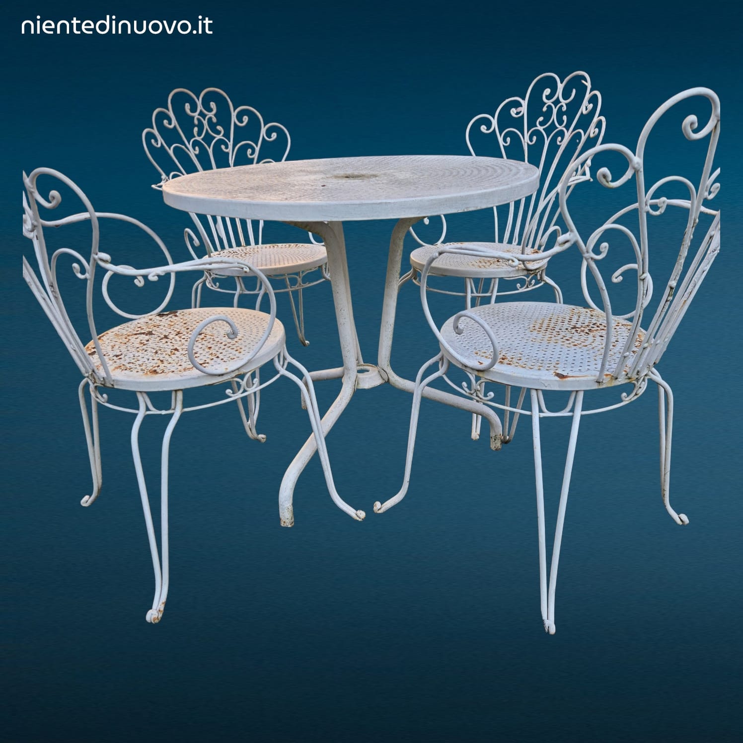 Set da esterno vintage in ferro battuto, composto da quattro sedie e un tavolino rotondo da 80 cm di diametro. L’insieme appartiene all’ambito dell’arredo da giardino di gusto classico e presenta una struttura solida. Lo stato generale è buono dal punto di vista strutturale, con vernice sollevata in più punti e presenza di ruggine superficiale che rende opportuna una riverniciatura.
