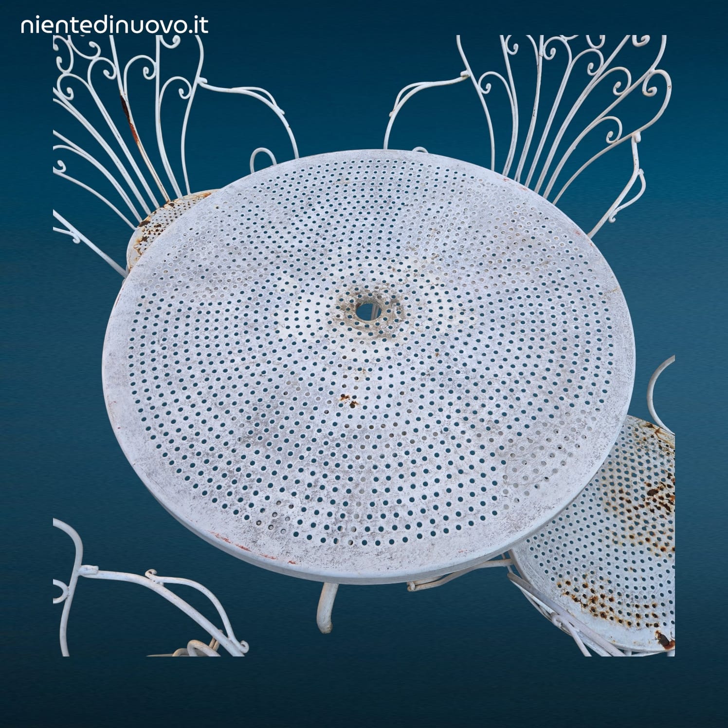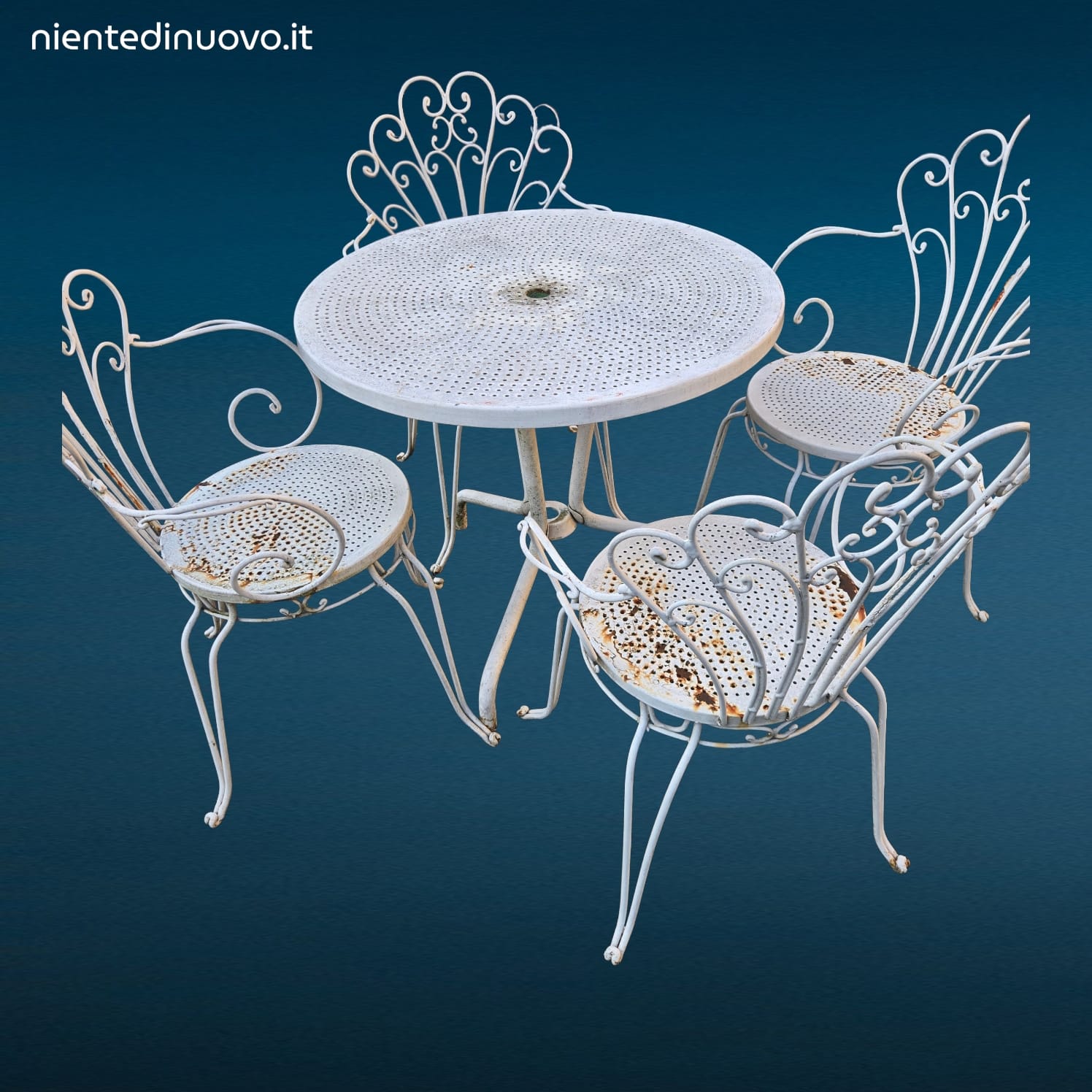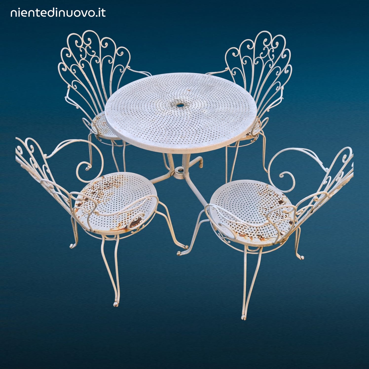 Set da esterno vintage in ferro battuto, composto da quattro sedie e un tavolino rotondo da 80 cm di diametro. L’insieme appartiene all’ambito dell’arredo da giardino di gusto classico e presenta una struttura solida. Lo stato generale è buono dal punto di vista strutturale, con vernice sollevata in più punti e presenza di ruggine superficiale che rende opportuna una riverniciatura.