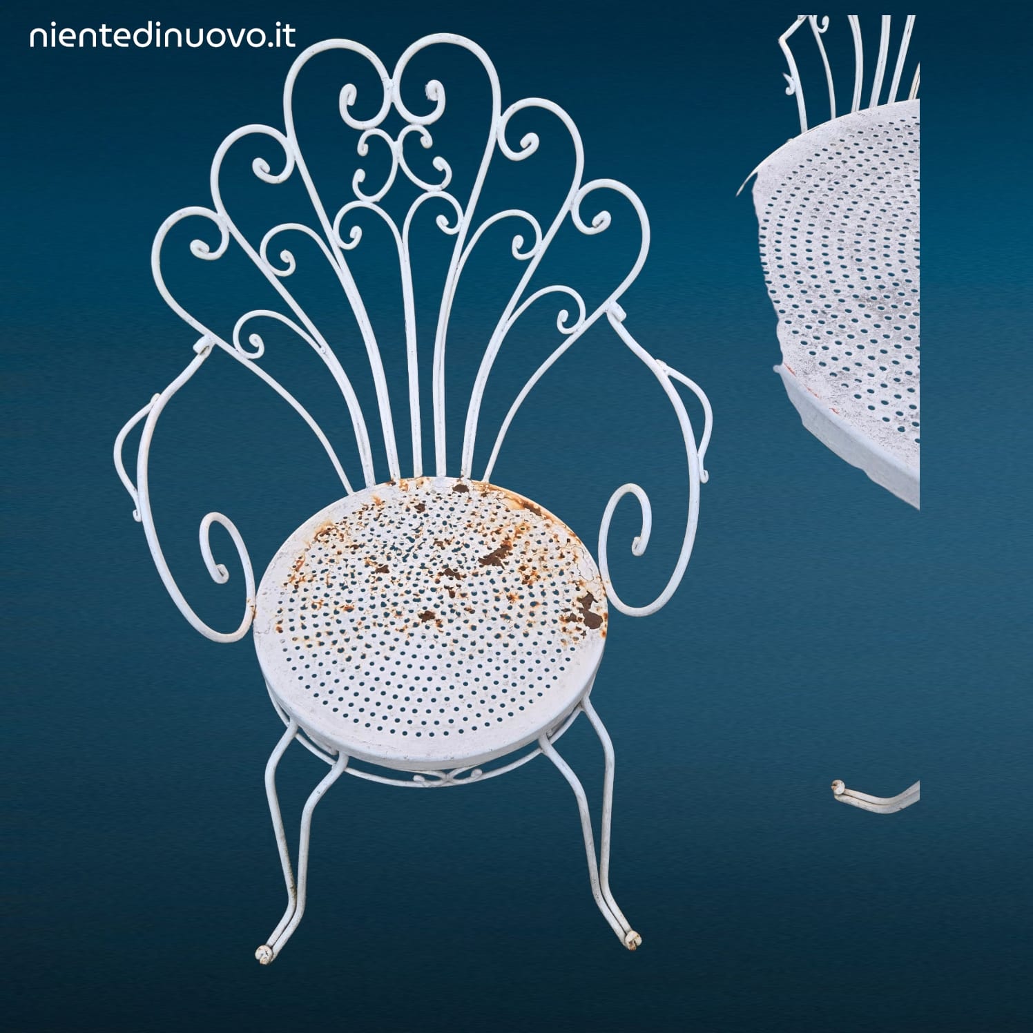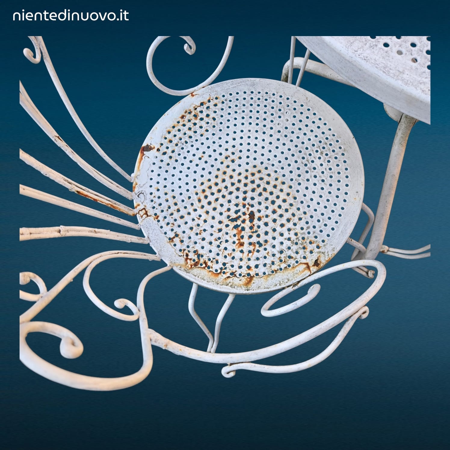 Dal punto di vista strutturale, le sedie e il tavolino si presentano sani e robusti. Le saldature risultano solide, aspetto importante per chi cerca un arredo ancora funzionale e stabile. Tuttavia, la finitura superficiale mostra i segni del tempo. In parecchi punti la vernice è sollevata e affiora la ruggine. Si consiglia quindi un intervento di riverniciatura, utile per migliorare la protezione del metallo e valorizzare l’estetica complessiva del set.