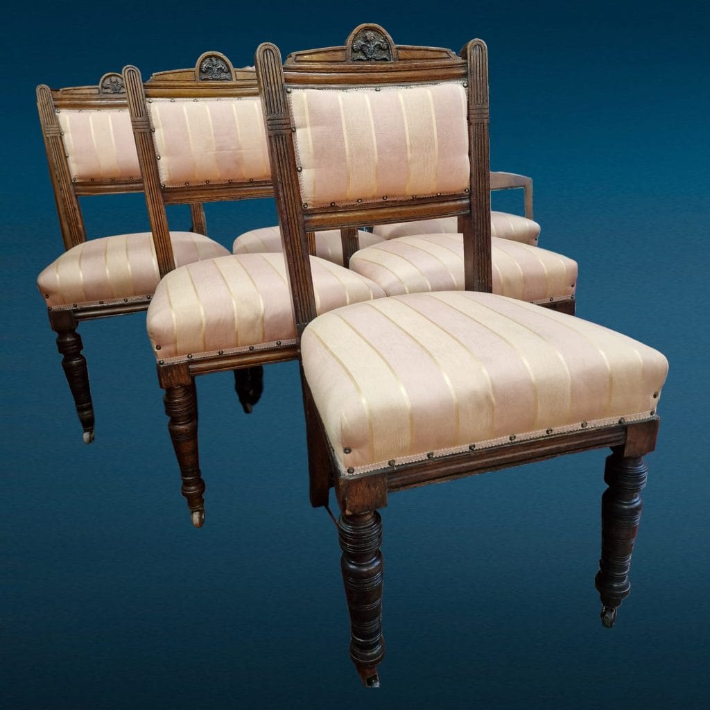 set di sei splendide e robustissime sedie antiche, imbottite con struttura in massello di rovere e gambe anteriori su rotelle.