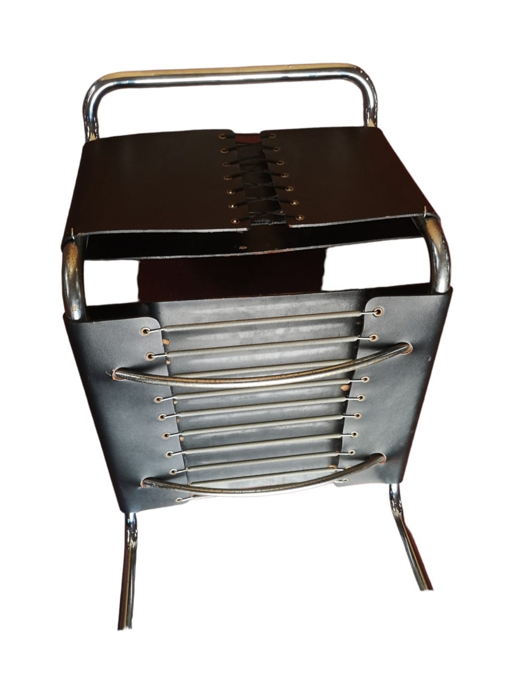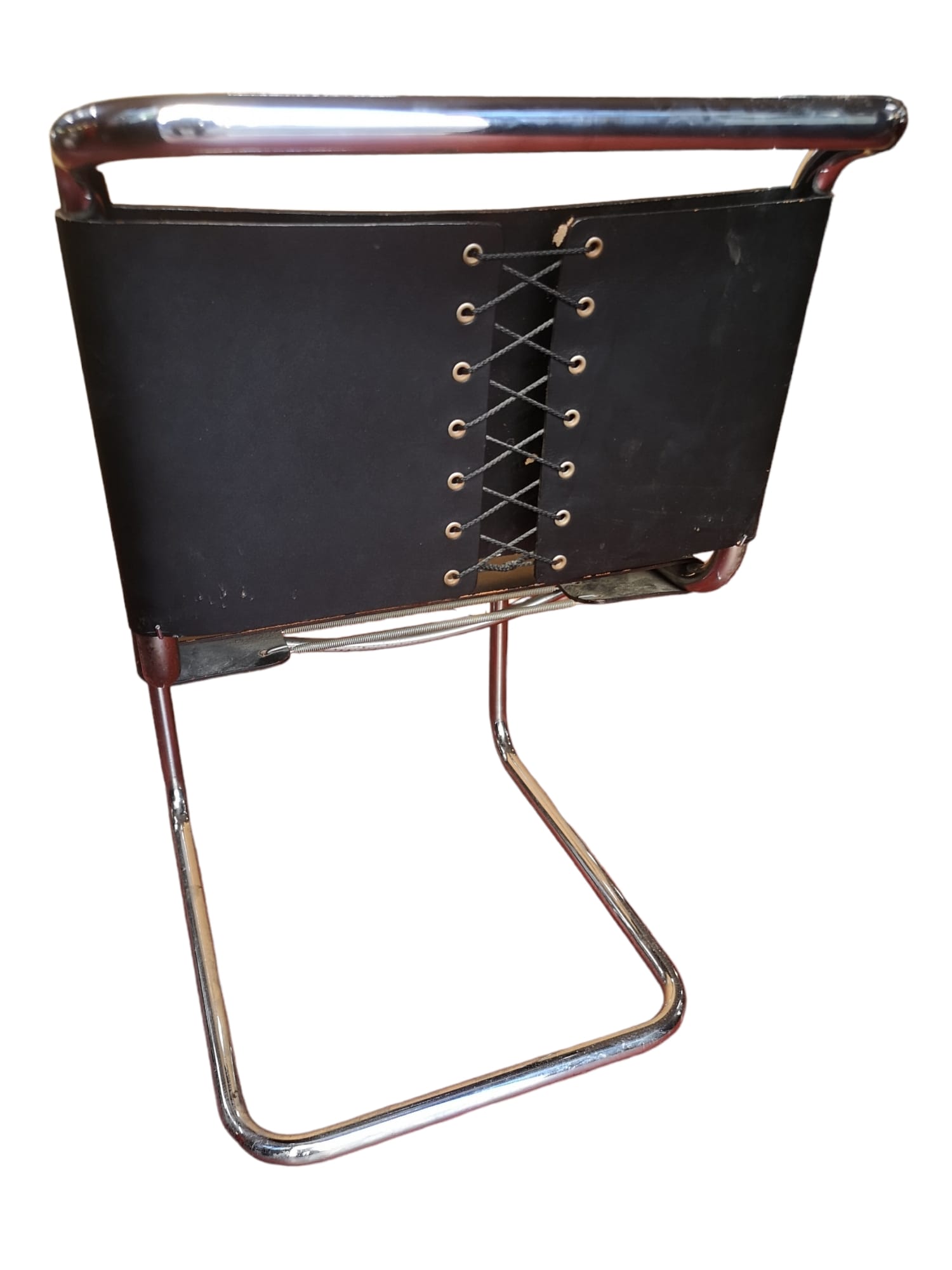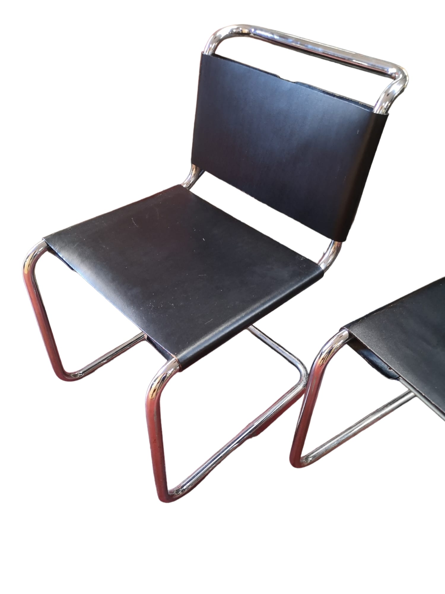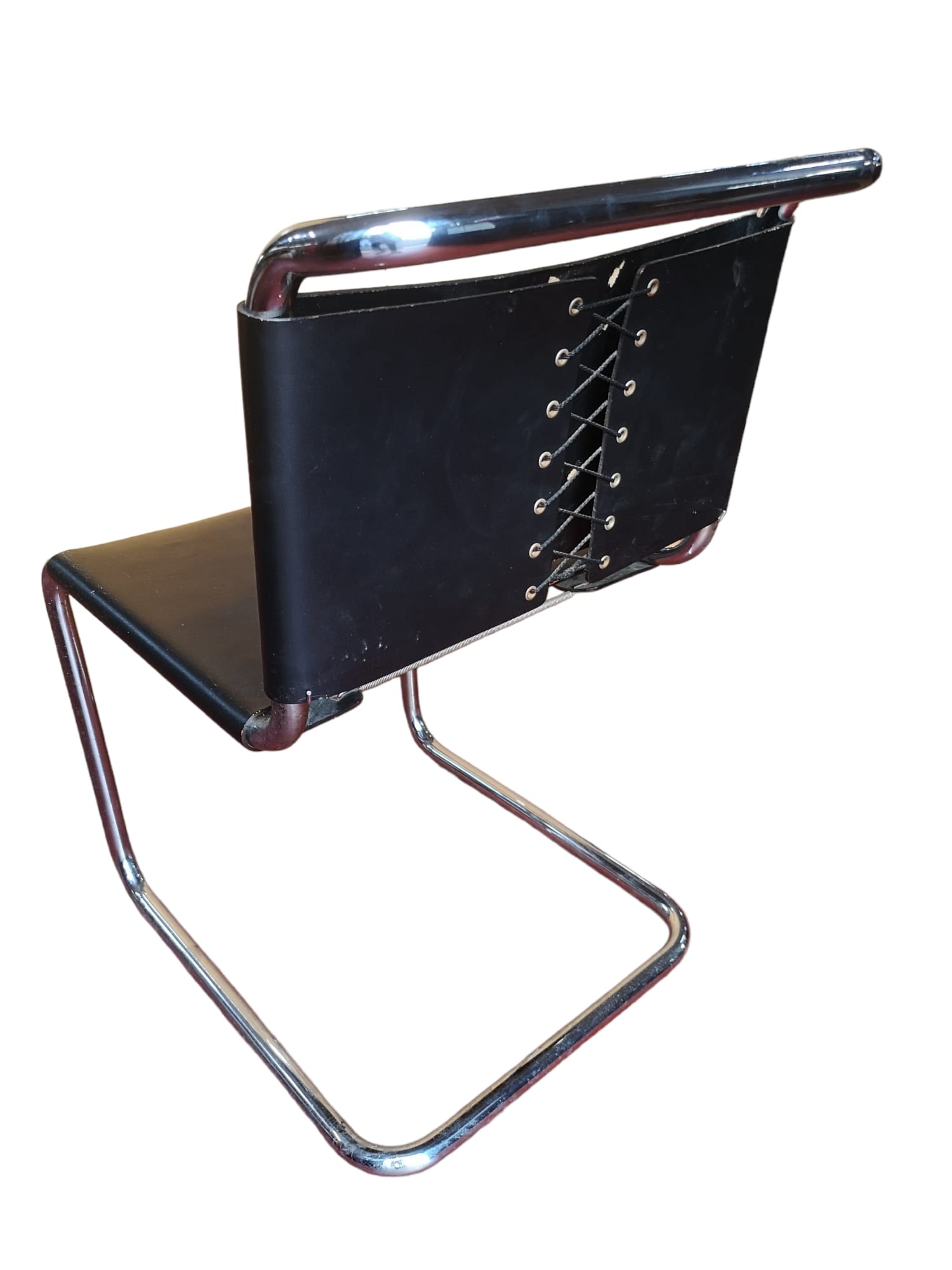 Sedia con struttura in tubo di acciaio cromato, sedile e schienale in cuoio pienofiore nero, un classico del design, un vero cult che si distinguerà in qualsiasi ambiente la inserirete.