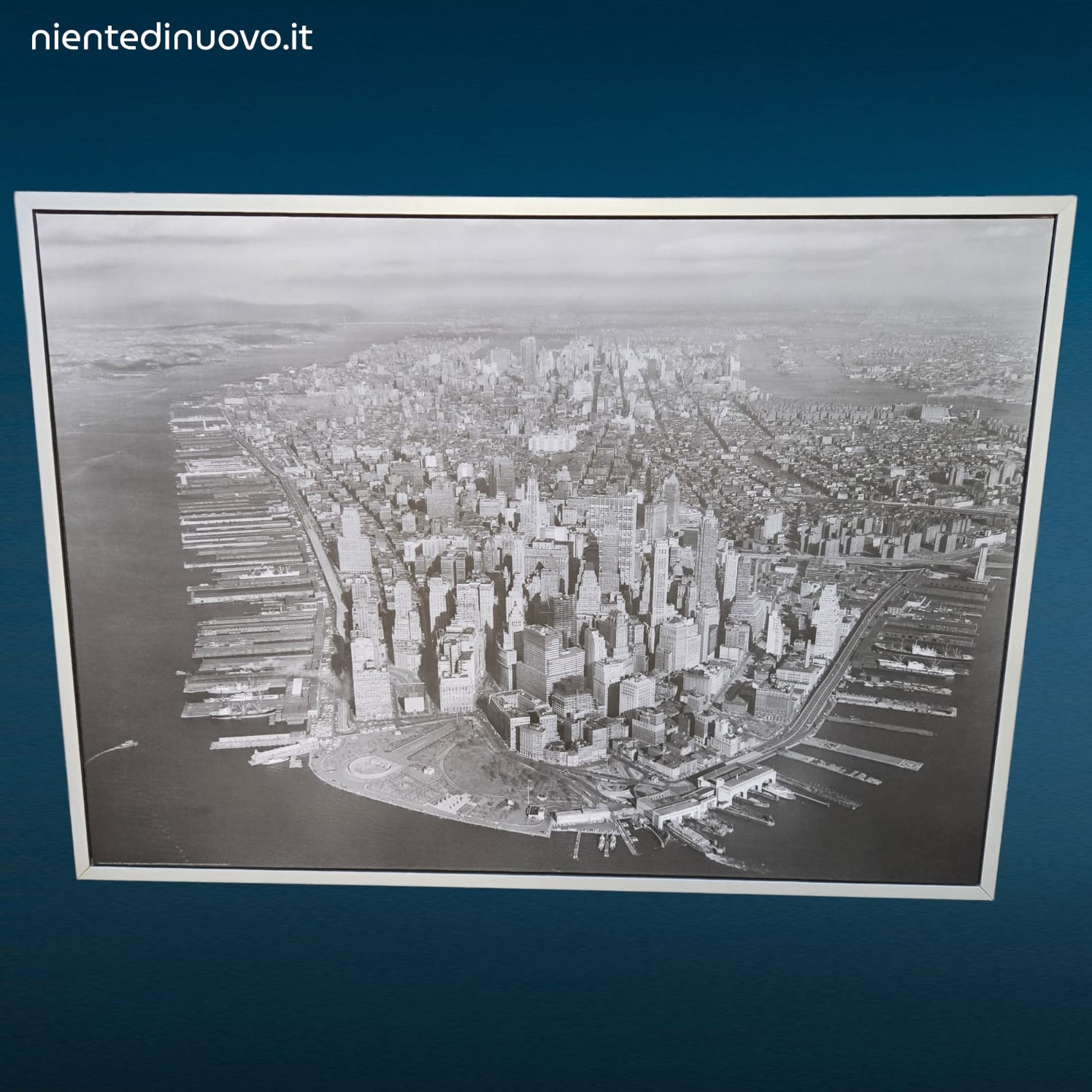 Stampa fotografica incorniciata raffigurante Manhattan vista dall’alto, riferibile agli anni Trenta del Novecento. L’opera documenta un soggetto urbano di ambito fotografico e decorativo, con attribuzione dello scatto a Philip Gendreau, come indicato. Si presenta come quadro da parete di gusto vintage, adatto a contesti di modernariato e arredo. Lo stato di conservazione generale non è specificato nei dati forniti.