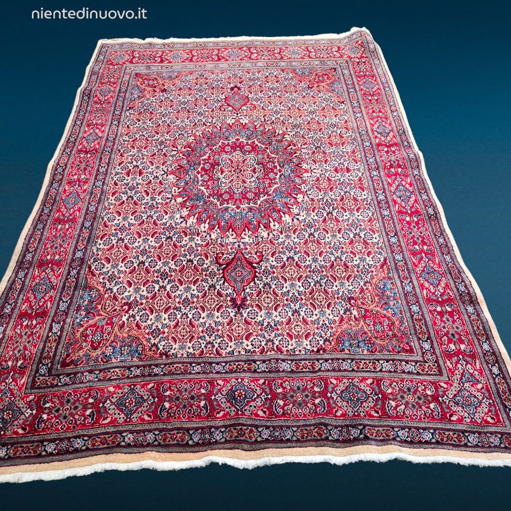 Il tappeto persiano Bidjar è stato lavato in acqua e trattato professionalmente da una ditta specializzata, pronta a garantire un prodotto igienizzato, privo di odori e pronto all’uso. Ogni dettaglio racconta la storia di una lavorazione minuziosa, tramandata da generazioni, con motivi floreali e geometrici tipici della tradizione persiana.