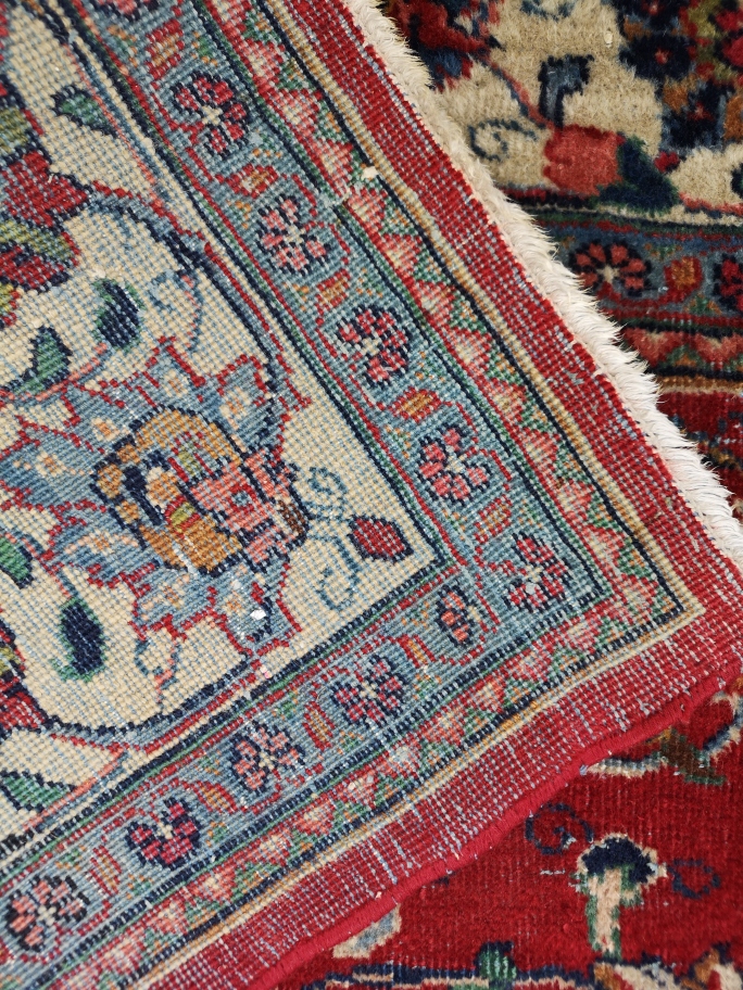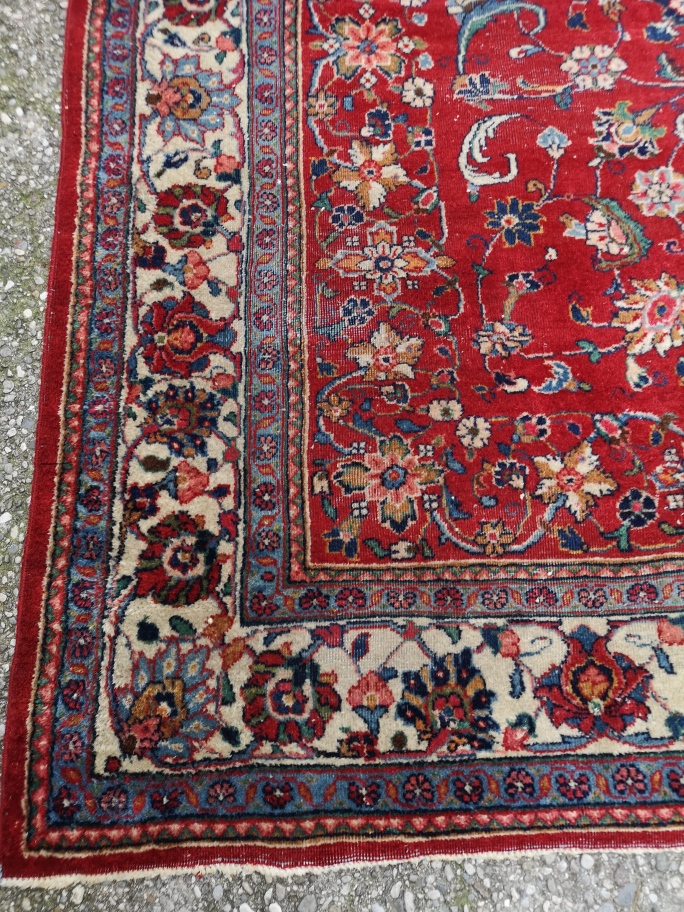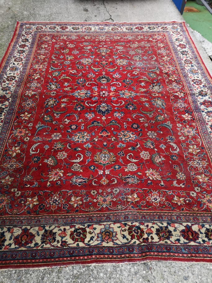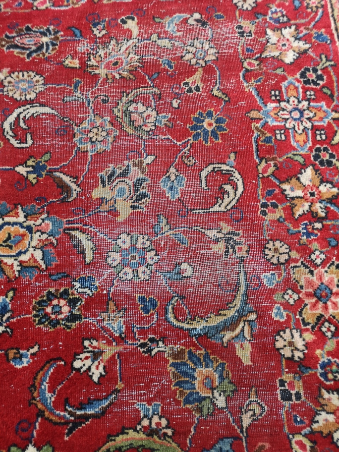 Il tappeto è stato sanificato e lavato da una ditta specializzata, quindi consegnato pulito e pronto all’uso. Trattandosi di un oggetto con oltre 70 anni di storia, presenta aree usurate dovute al passaggio, più evidenti in alcuni punti. Tuttavia, queste caratteristiche non ne compromettono la bellezza, anzi ne aumentano il fascino, raccontando una storia autentica.