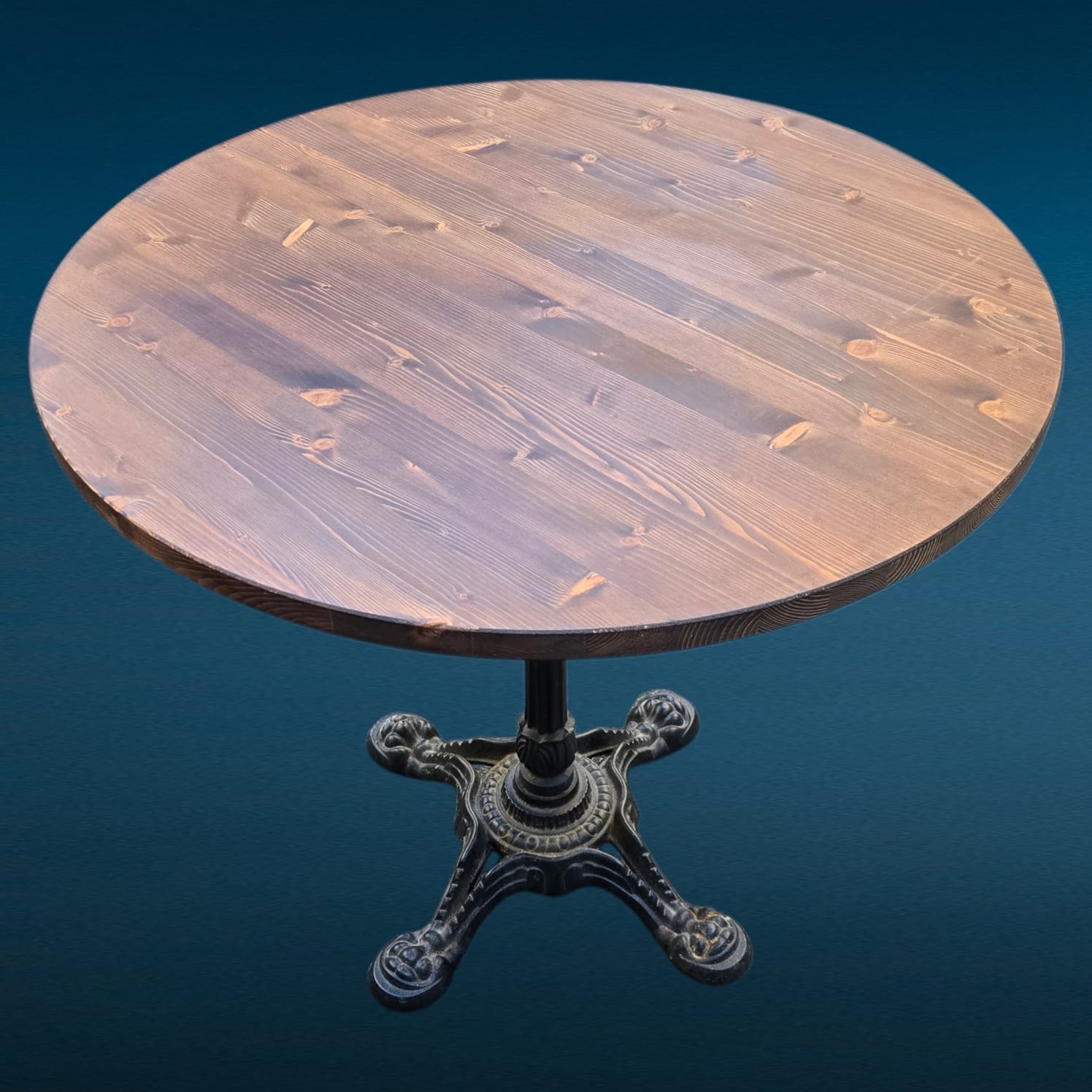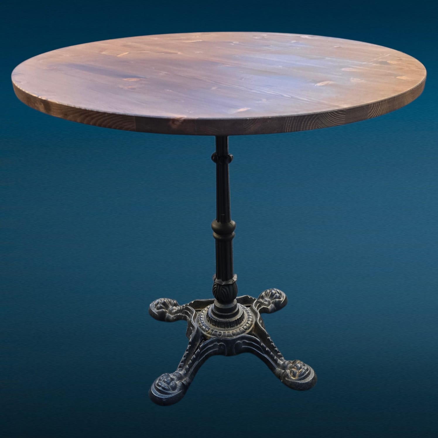 Tavolino da bar con base in ghisa lavorata e piano in legno massello tinto noce da 80 cm. Robusto, stabile e disponibile in otto pezzi venduti singolarmente.