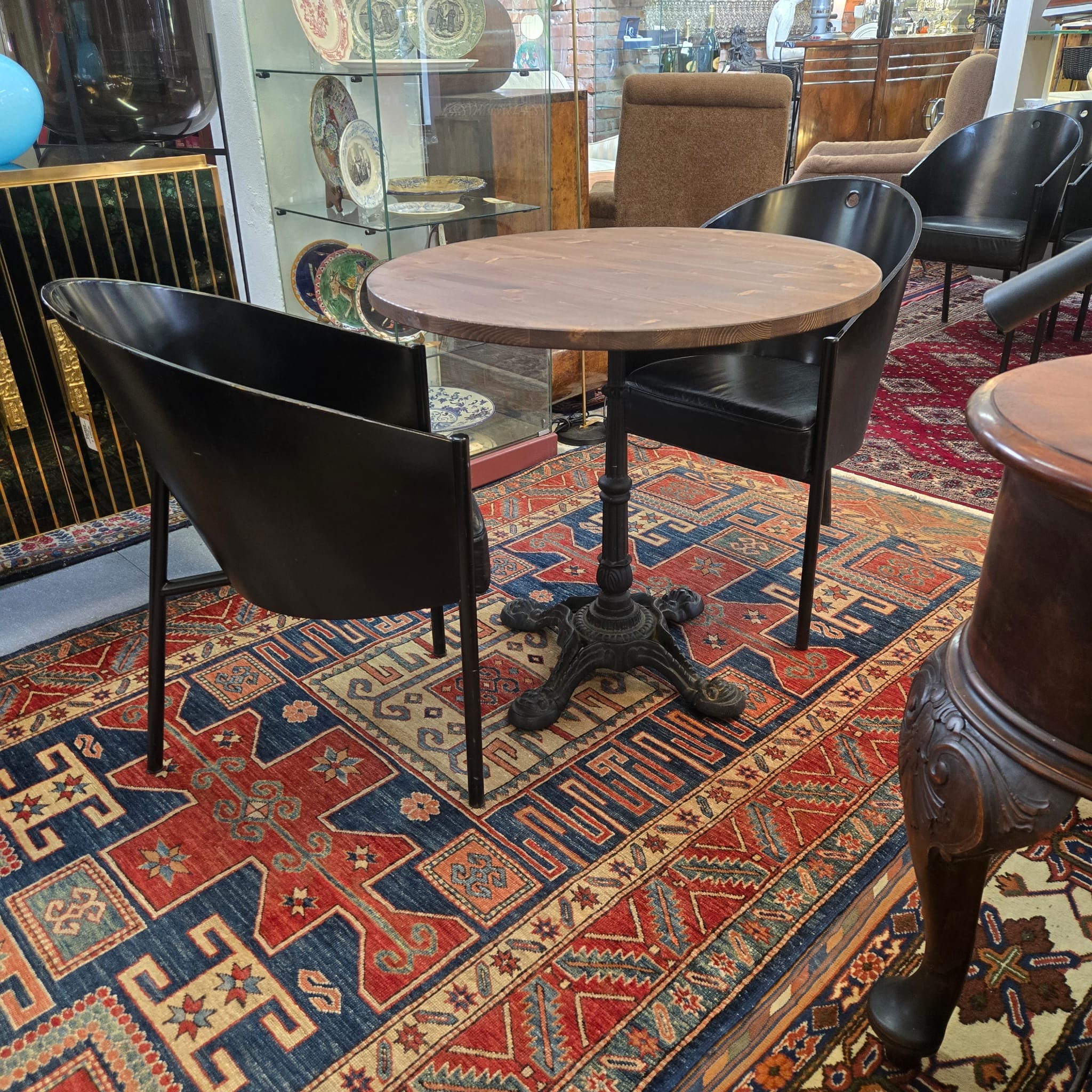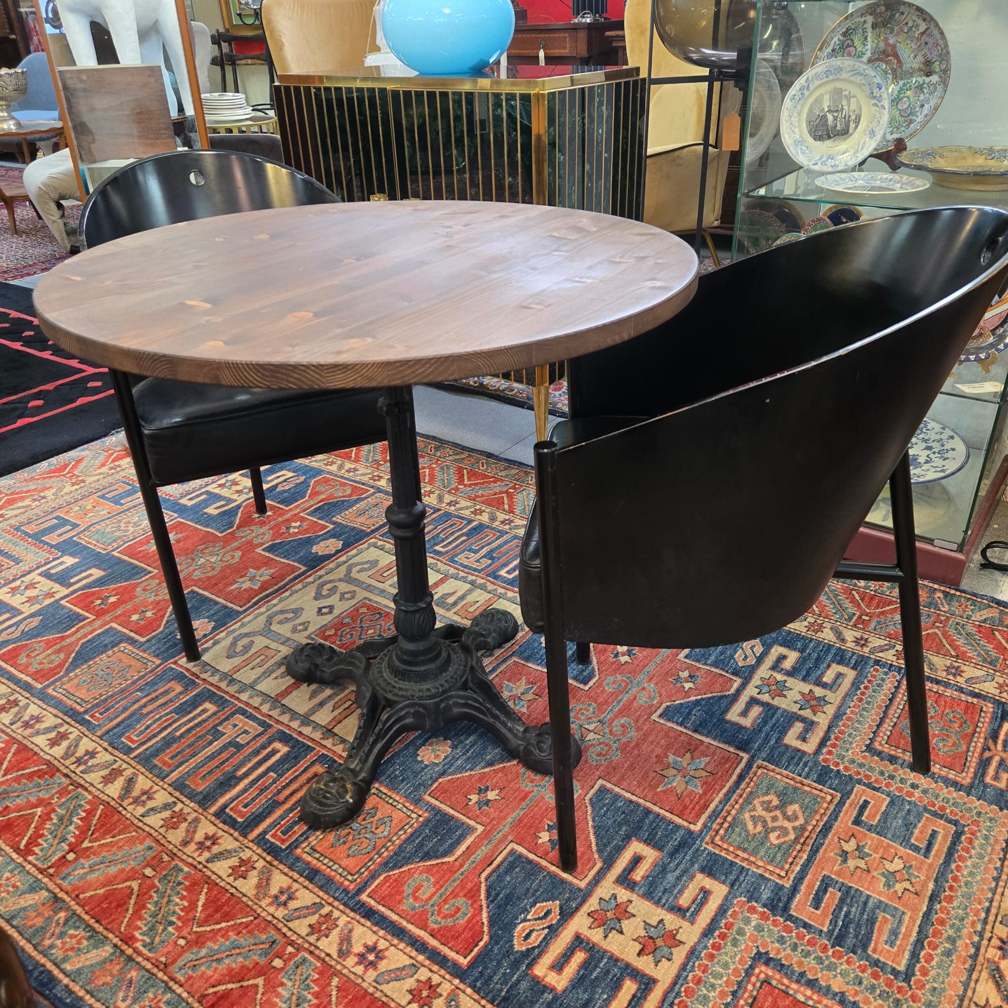 Tavolino da bar con struttura solida e base in ghisa lavorata, adatto ad ambienti interni. Piano circolare in legno massello tinto noce con diametro di 80 cm. Produzione di gusto tradizionale, ideale per arredi di locali o spazi domestici. Stato di conservazione buono, struttura stabile e pronta all’uso. Disponibili otto pezzi venduti singolarmente.