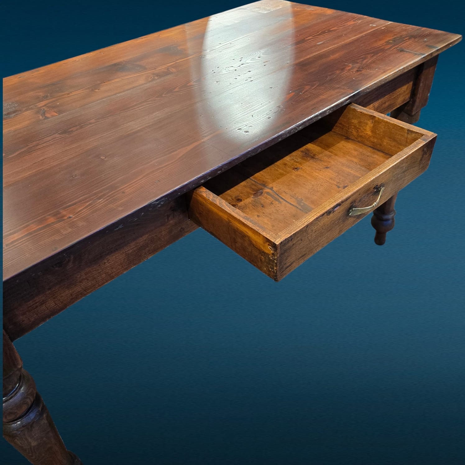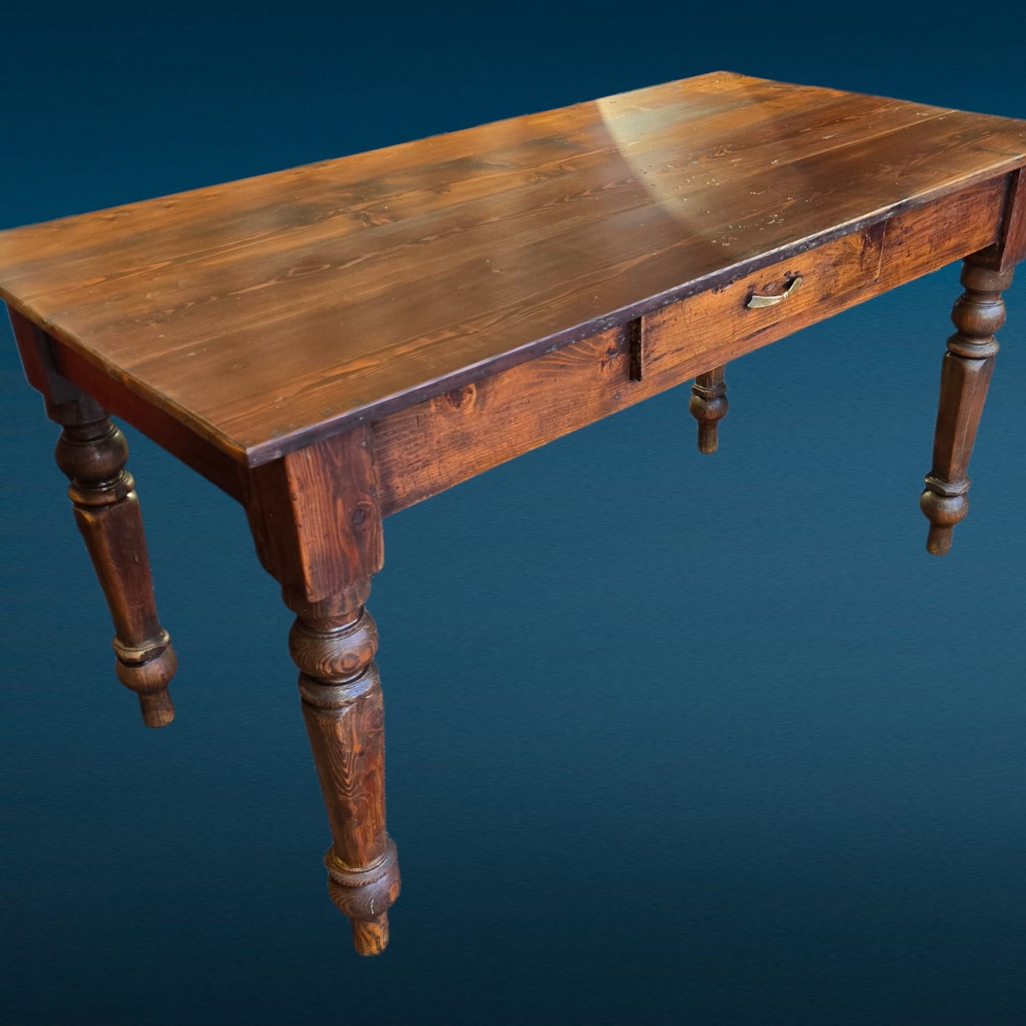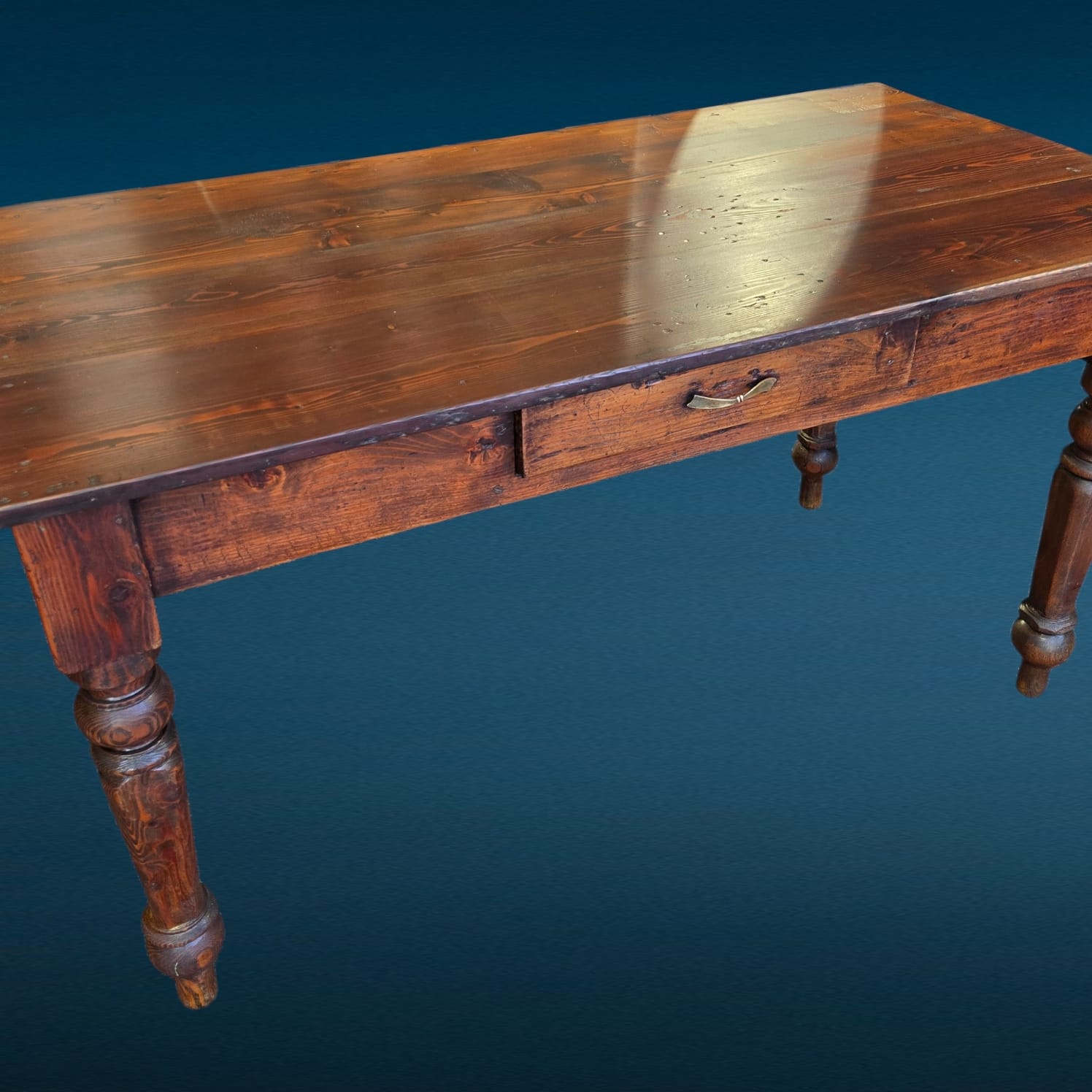 Il piano mostra la naturale venatura del larice, essenza apprezzata per resistenza e durata. Il colore caldo e le sfumature del tempo donano carattere senza alterare l’integrità del mobile. Inoltre, la presenza del cassetto centrale aumenta la praticità, rendendolo adatto sia come tavolo da cucina sia come tavolo da lavoro o scrittoio rustico.