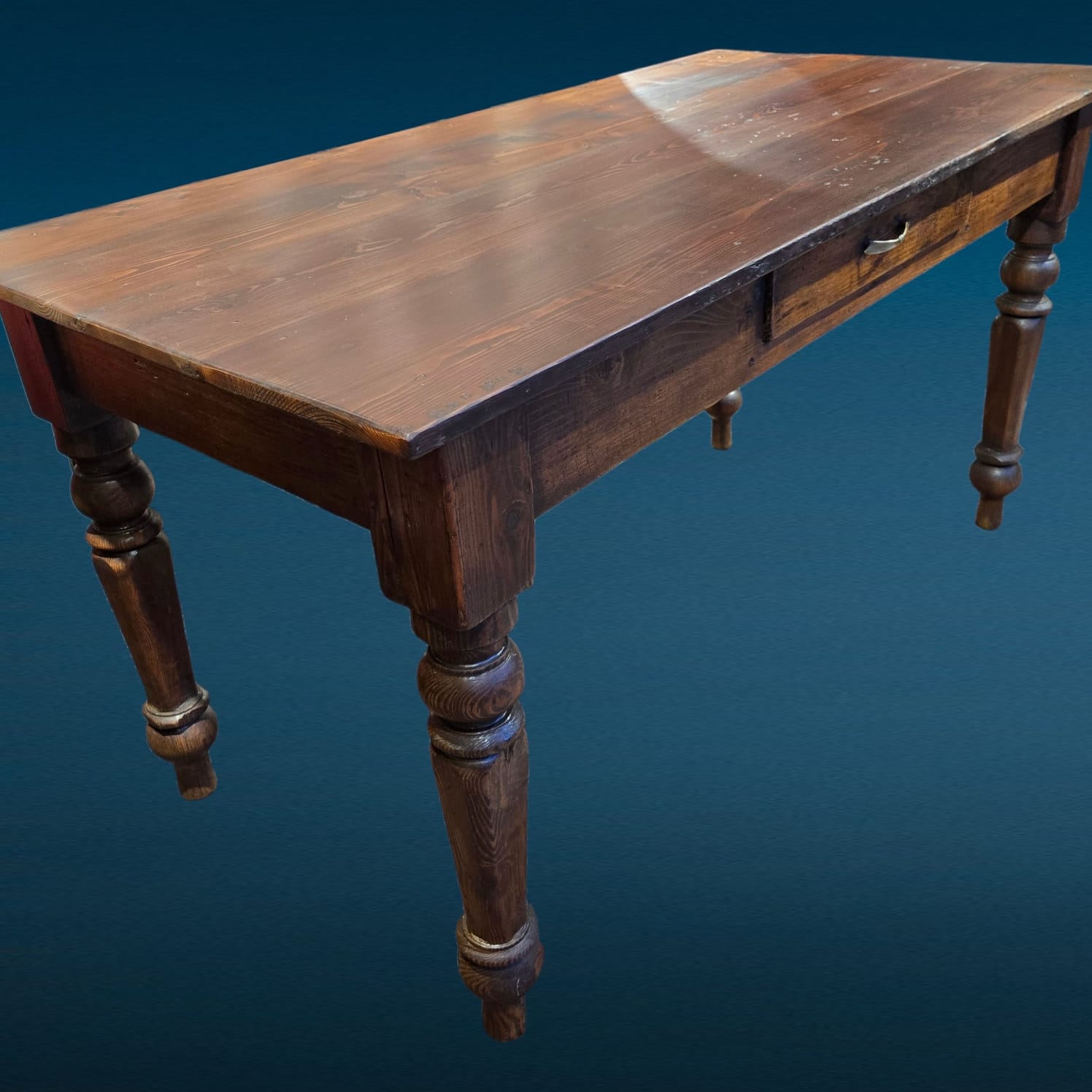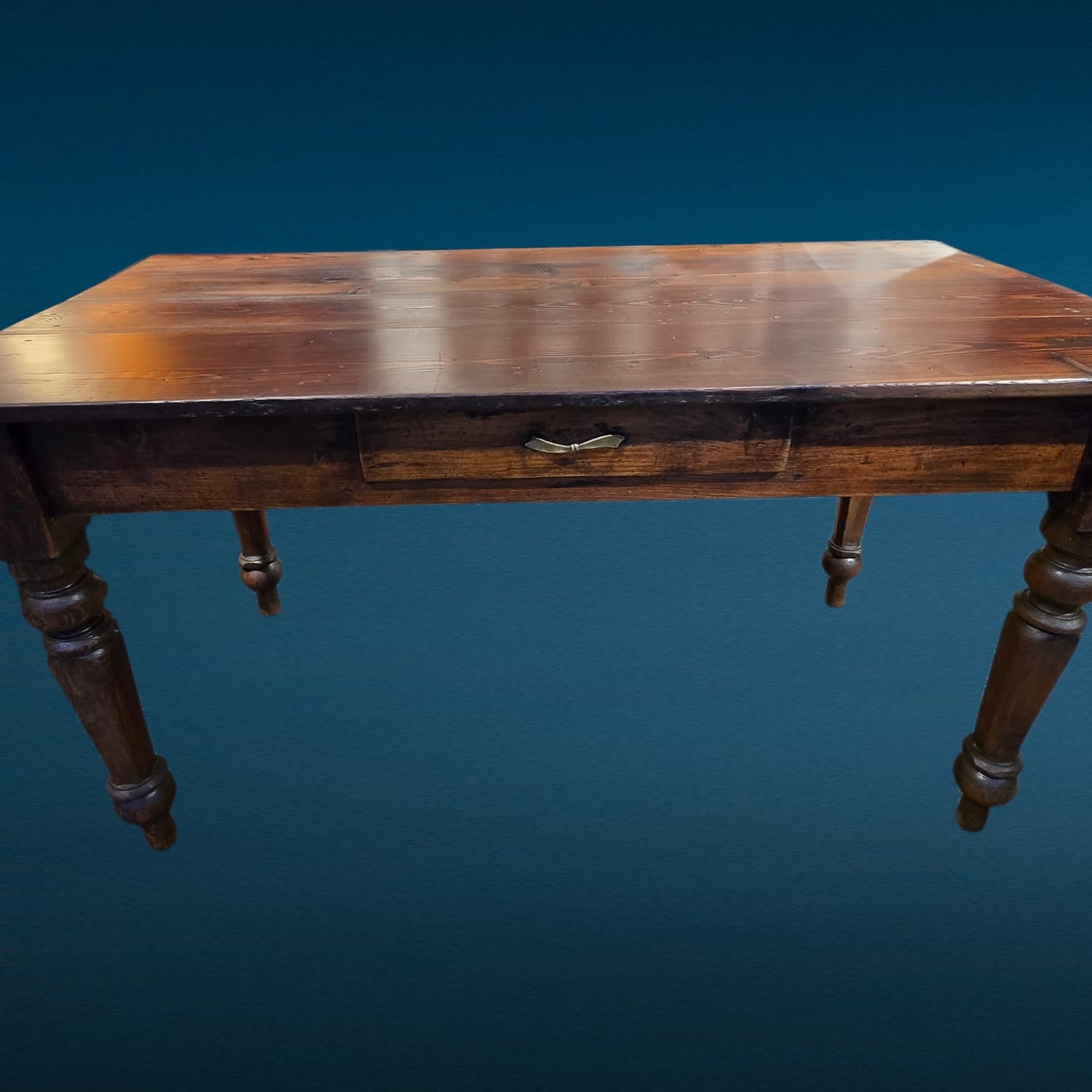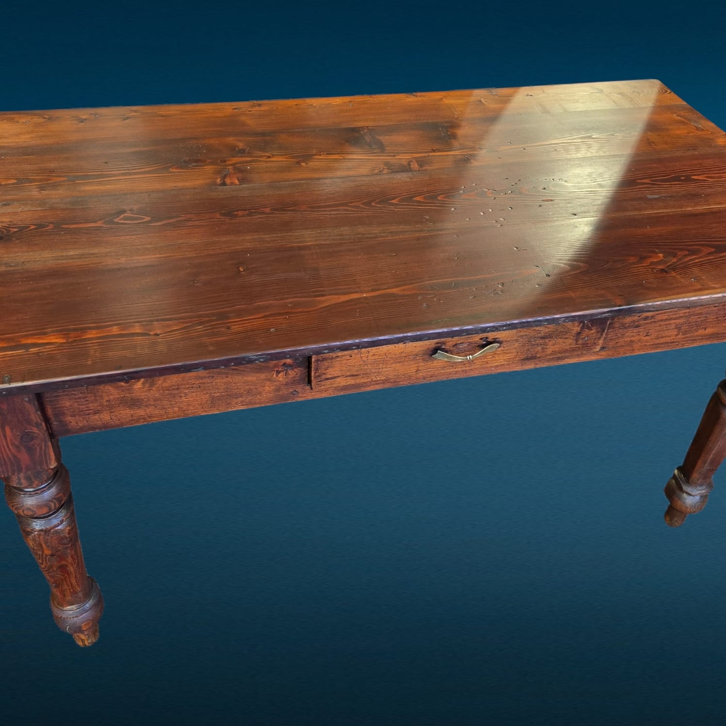 Il piano mostra la naturale venatura del larice, essenza apprezzata per resistenza e durata. Il colore caldo e le sfumature del tempo donano carattere senza alterare l’integrità del mobile. Inoltre, la presenza del cassetto centrale aumenta la praticità, rendendolo adatto sia come tavolo da cucina sia come tavolo da lavoro o scrittoio rustico.