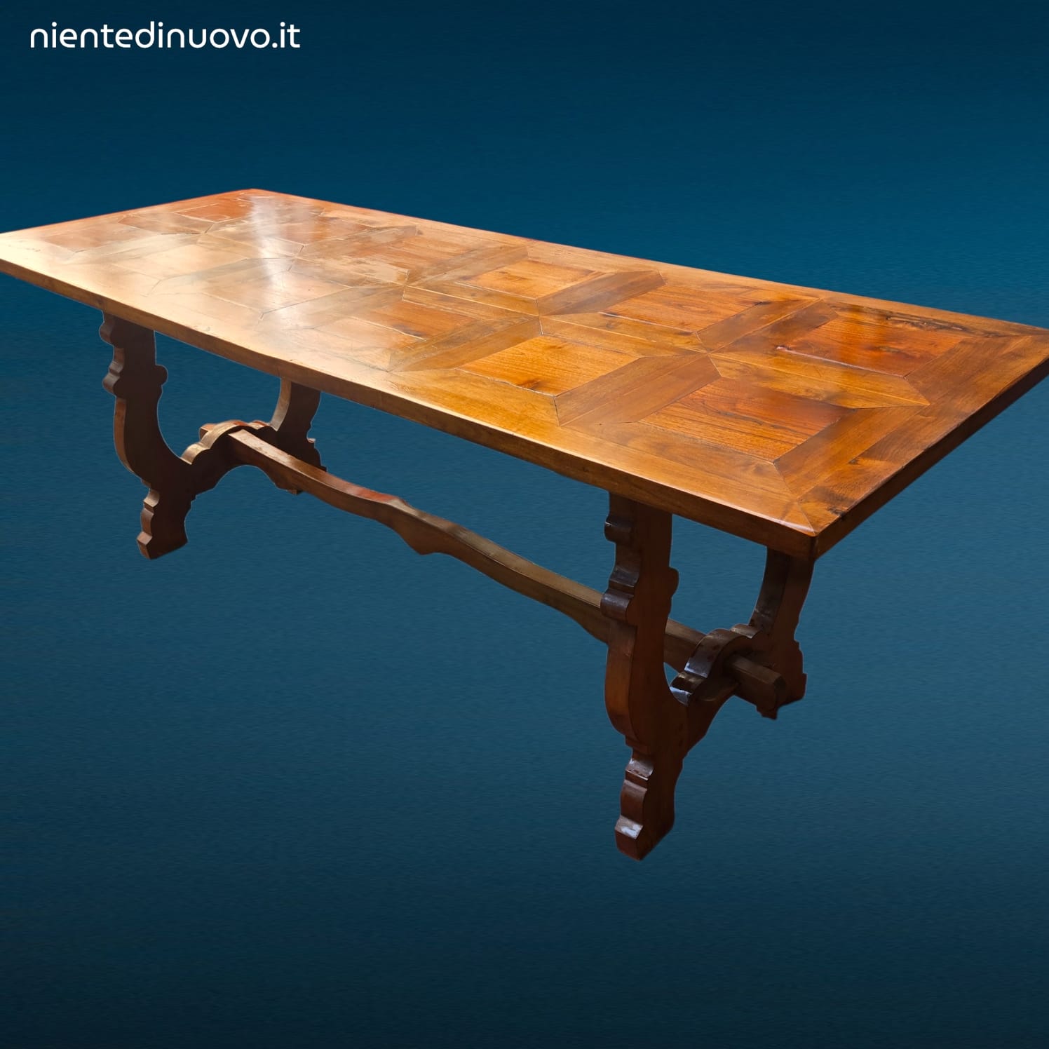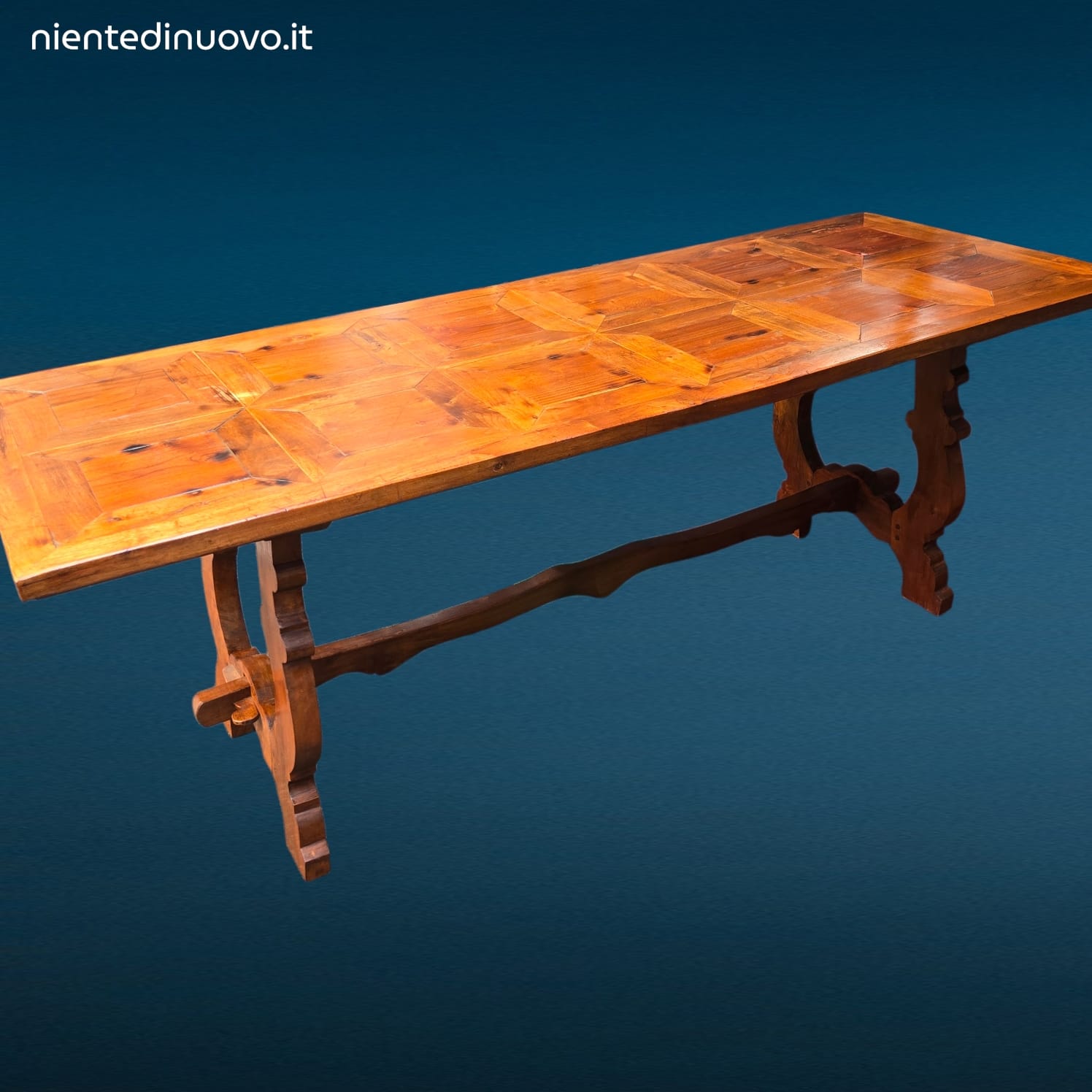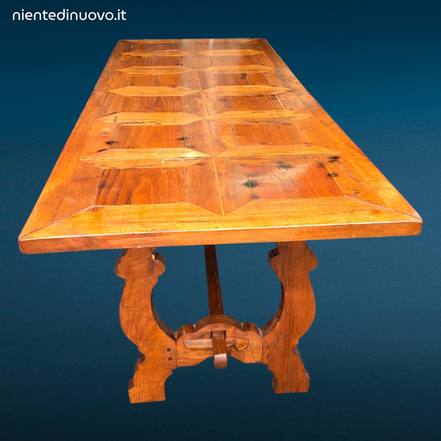 Tavolo in legno con piano a formelle intarsiate, robusto e stabile. In buone condizioni generali, con piano leggermente irregolare e consigliata levigatura.