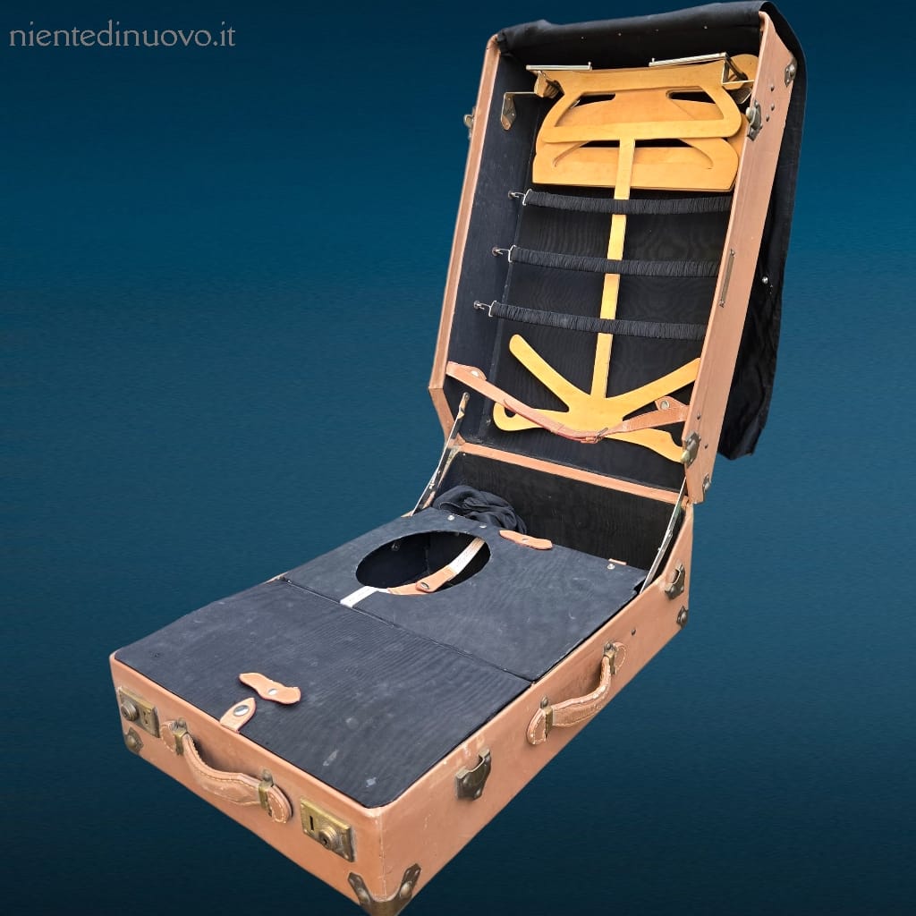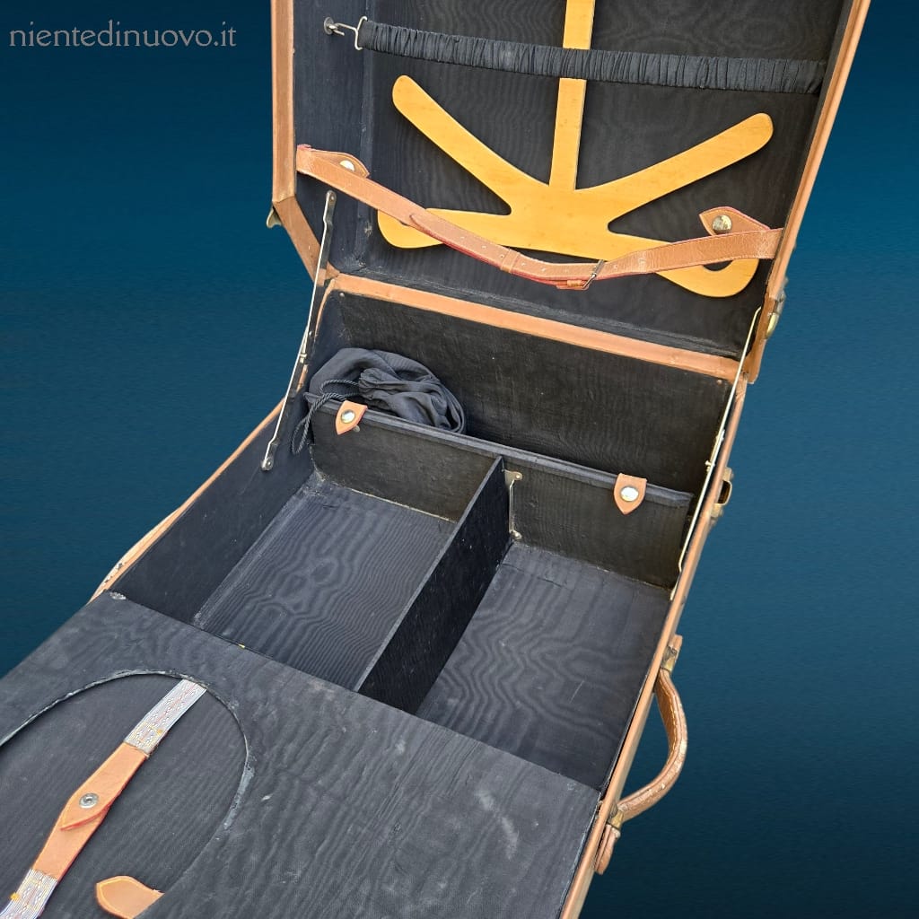Particolarmente interessante è la presenza di uno spazio dedicato alla bombetta, elemento distintivo di un’epoca in cui anche l’accessorio era parte fondamentale del viaggio elegante. La struttura solida e l’organizzazione interna rendono questo baule non solo un oggetto decorativo, ma anche una preziosa testimonianza del design funzionale del primo Novecento.